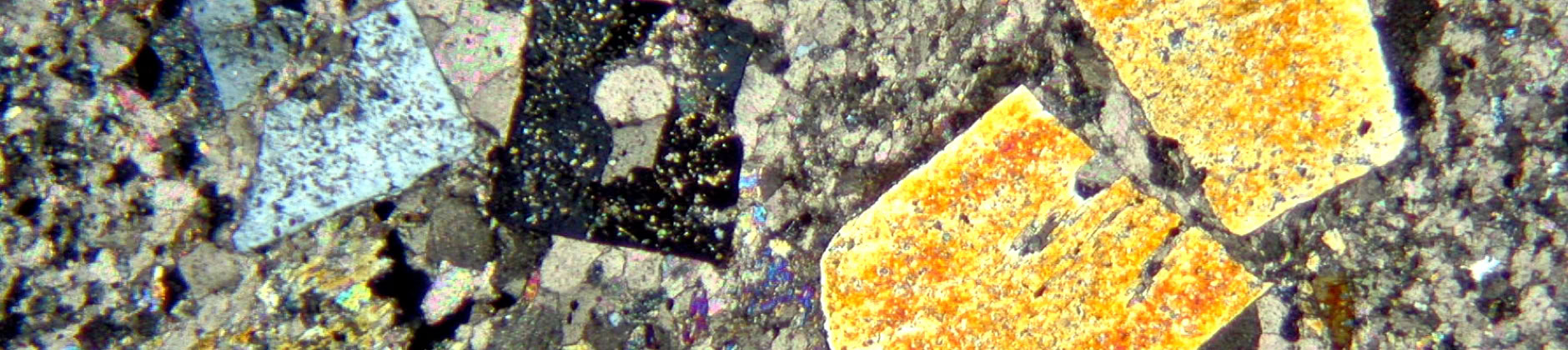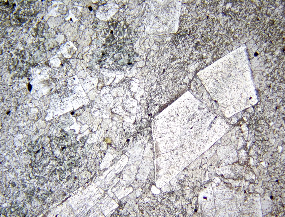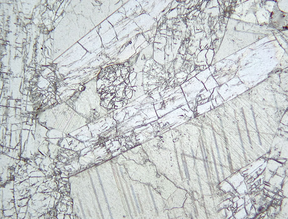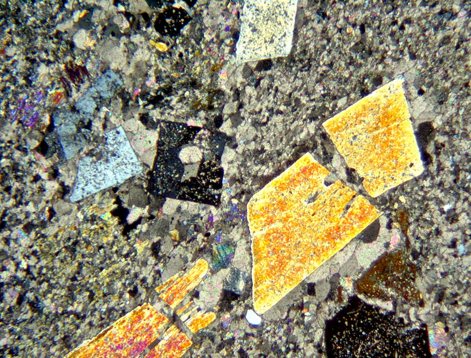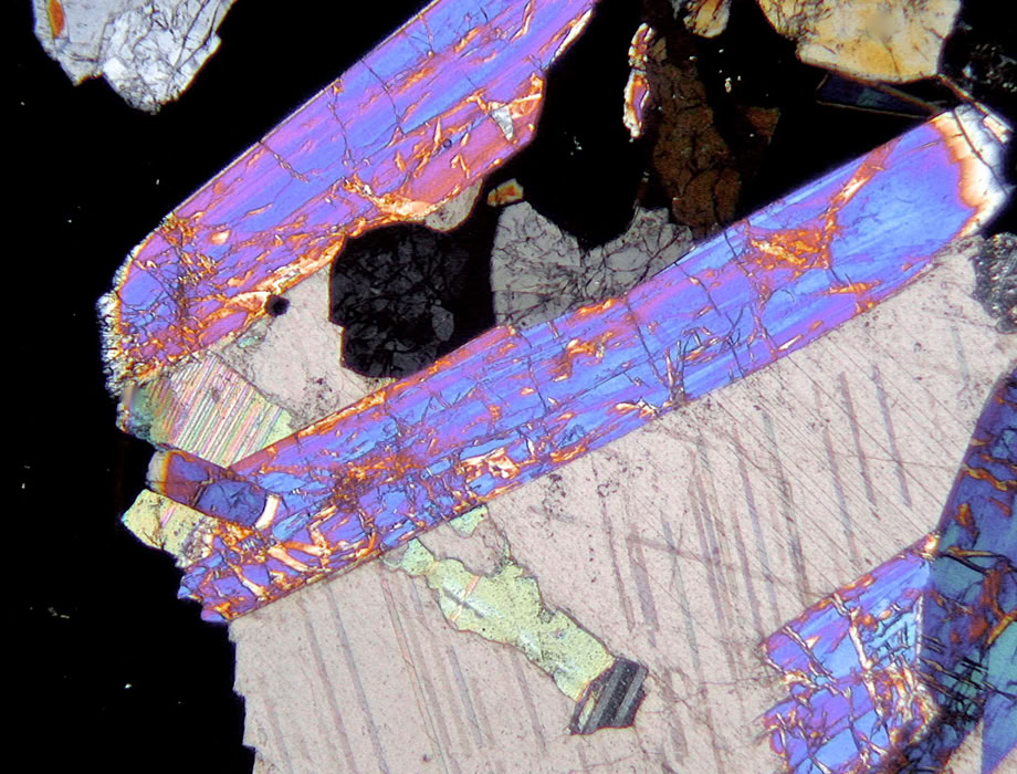 Con luz polarizada se observan secciones con diferente birrefringencia y una sección isótropa (cuadrada), perpendicular al eje c del cristal.