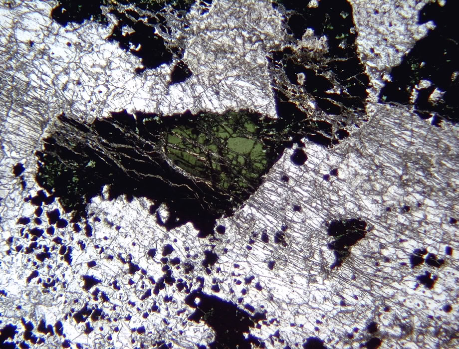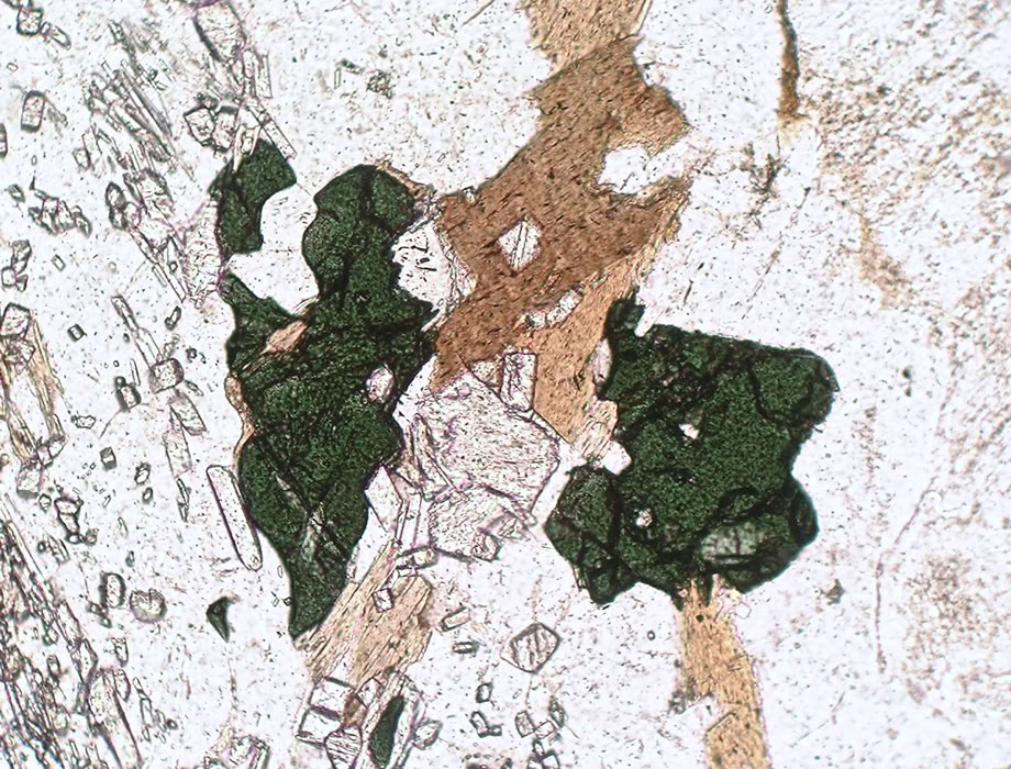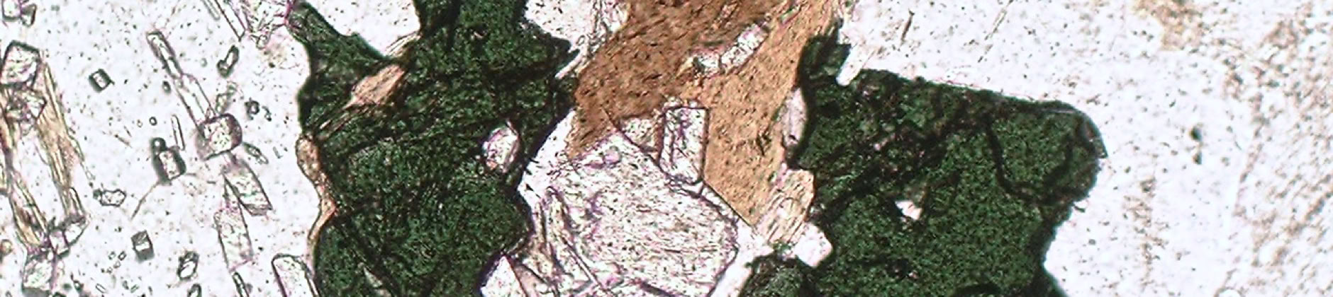 Espinela (hercinita) en un skarn (diópsido, flogopita, y min. opacos=magnetita).