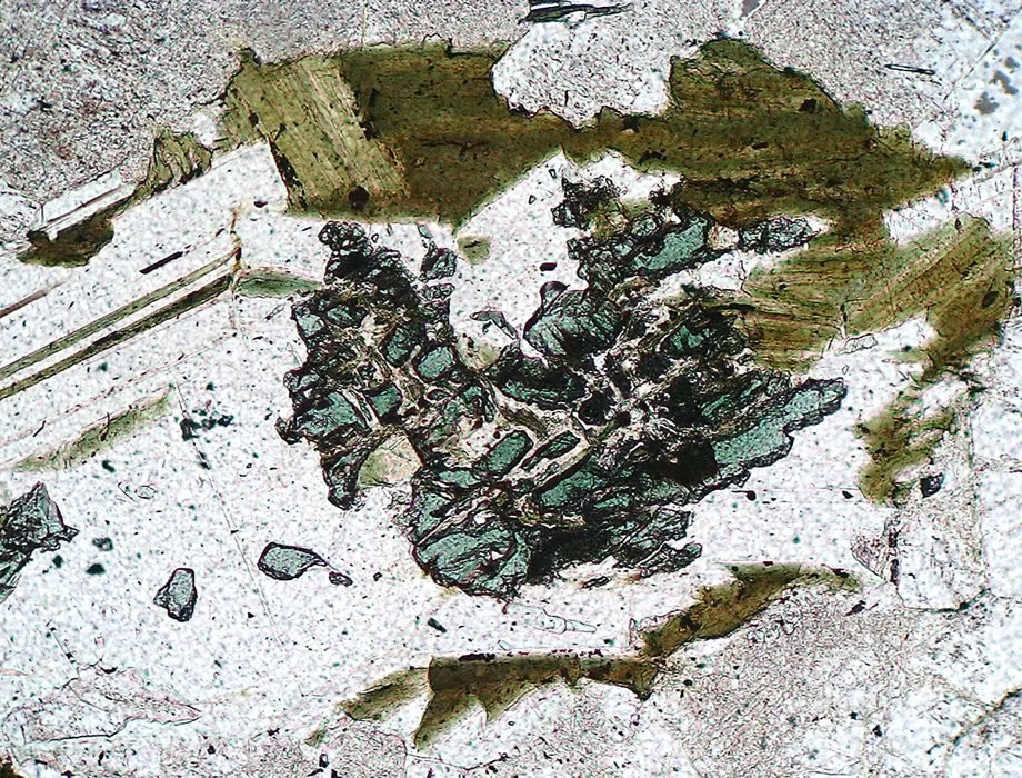 Cristales xenomorfos de gahnita (Zn-espinela) de color verde claro, en una cavidad miarolítica de una roca granítica (cuarzo, plagioclasa, turmalina, biotita cloritizada, moscovita).