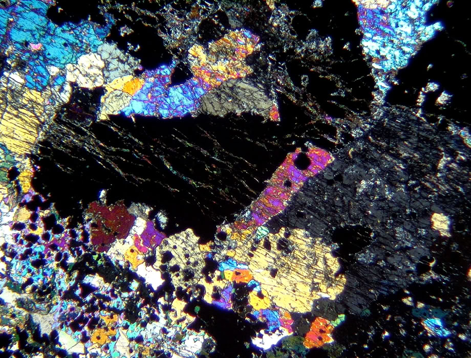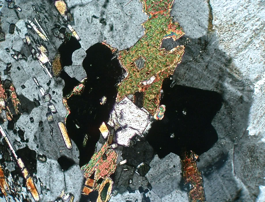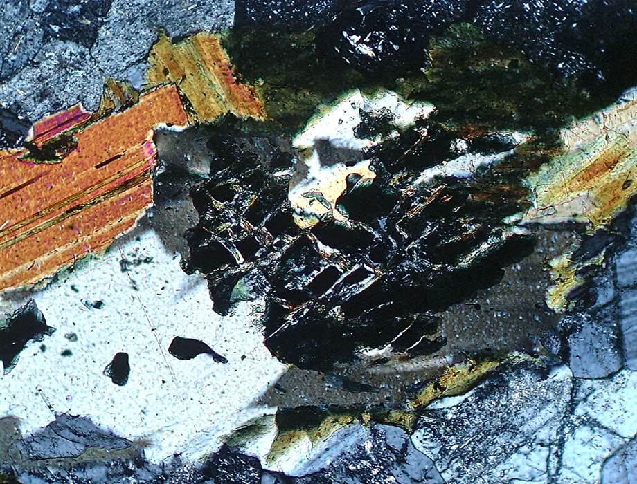 Espinela (hercinita) en una granulita (feldespato potásico, cuarzo, biotita, plagioclasa, sillimanita).