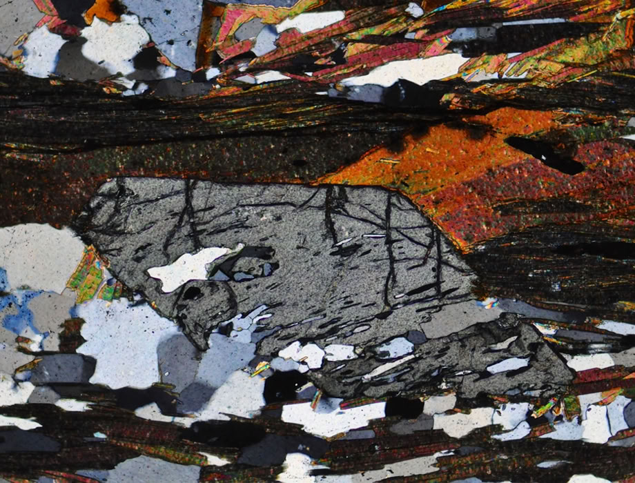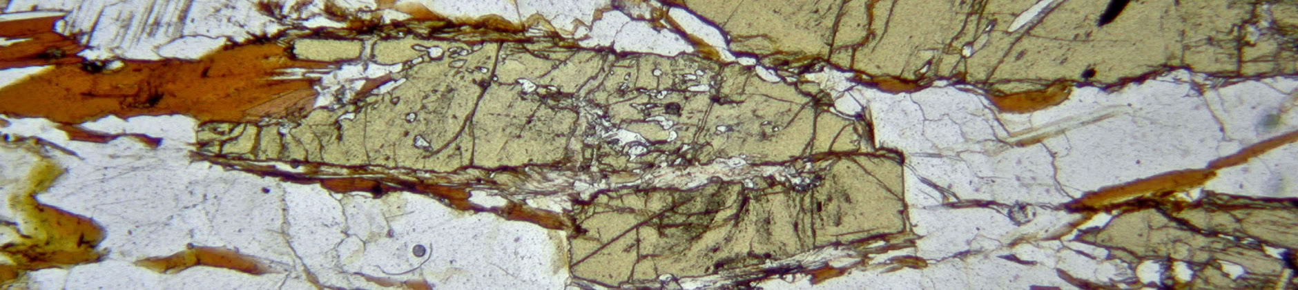 Cristal subautomorfo de estaurolita en un esquisto (cuarzo, biotita,, moscovita, plagioclasa, feldespato potasio, turmalina, zircón y min. opacos).