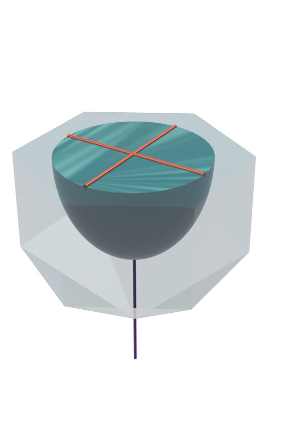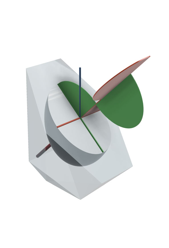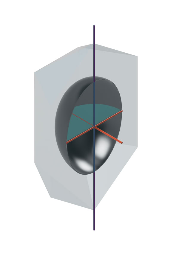 Modelos representando diferentes secciones de un cristal de cuarzo. Izquierda: sección longitudinal (paralela al eje óptico) de birrefringencia máxima. Centro: sección transversal (perpendicular al eje óptico) e isótropa. Derecha: sección cualquiera entre estas dos con birrefringencia intermedia. Los índices de refracción se representan en: azul claro, el correspondiente al rayo extraordinario (ε), en naranja el correspondiente al ordinario (ω), y los índices intermedios (ε’) en verde.