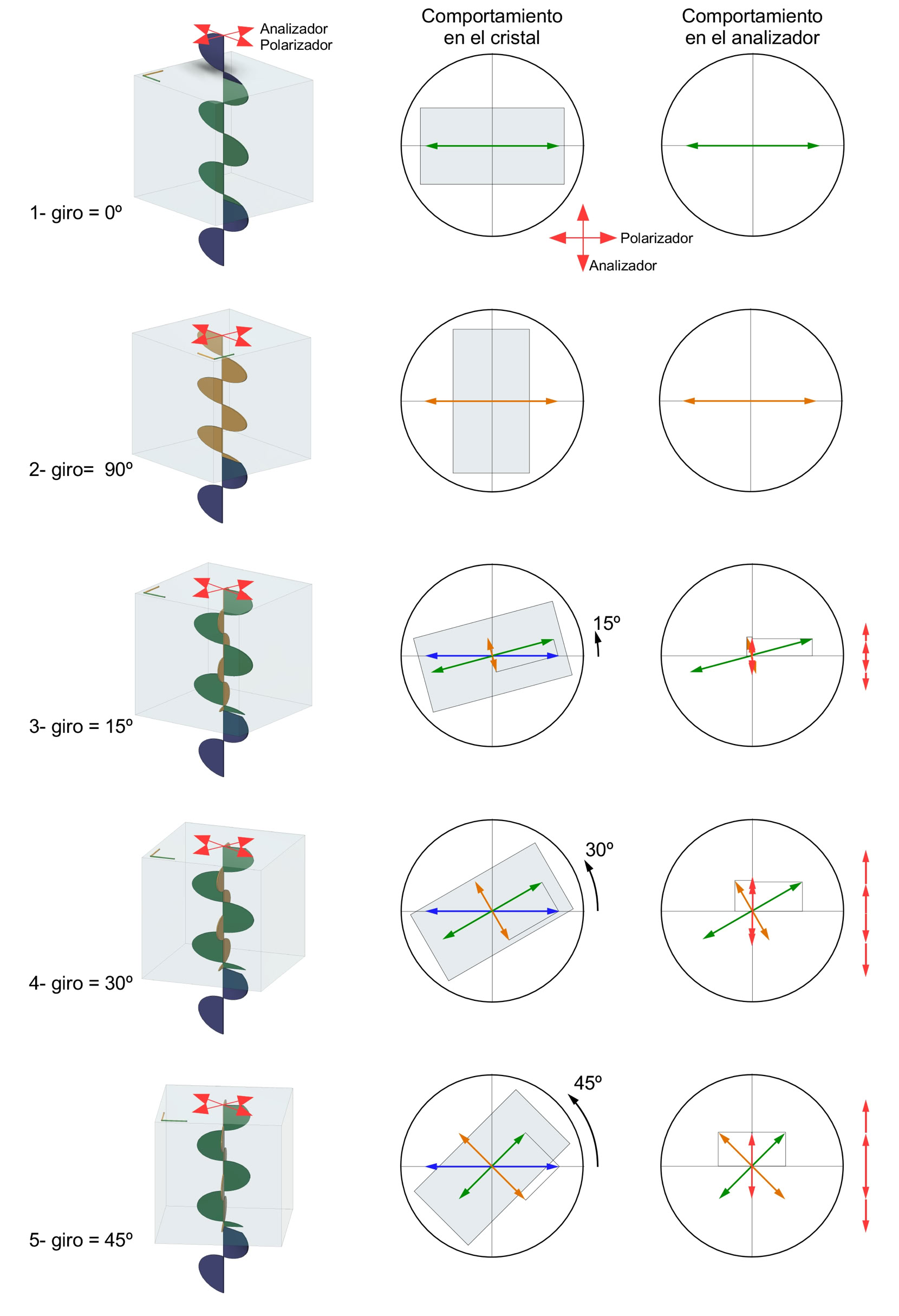 En los casos mostrados en la figura (casos 3, 4 y 5) los vectores azules (orientados este-oeste) representan la luz polarizada incidente que coincide con la posición del polarizador del microscopio. Este rayo se desdobla en dos rayos polarizados perpendiculares entre sí que coinciden con las direcciones de vibración preferentes del cristal (vectores anaranjados y verdes). La amplitud relativa, de la que depende la intensidad de cada rayo, varía con el ángulo de giro. En todos los casos (esquemas centrales de los casos 1 a 5) la intensidad de la luz que emerge del cristal es la misma, exceptuando los minerales pleocroicos (ver Raith et al., 2012). En los esquemas de la derecha se muestran (vectores rojos) los componentes note-sur, obtenidos por descomposición vectorial, que coinciden con la dirección preferente del segundo polarizador y son capaces de atravesarlo, de manera que la máxima iluminación se da cuando el mineral está girado 45º desde su posición de extinción (caso 5). Como la luz utilizada, en el microscopio, es blanca, y por lo tanto policromática, el color de interferencia depende de las proporciones, de cada una de las diferentes longitudes de onda, que atraviesan este segundo polarizador (fenómenos de interferencia).