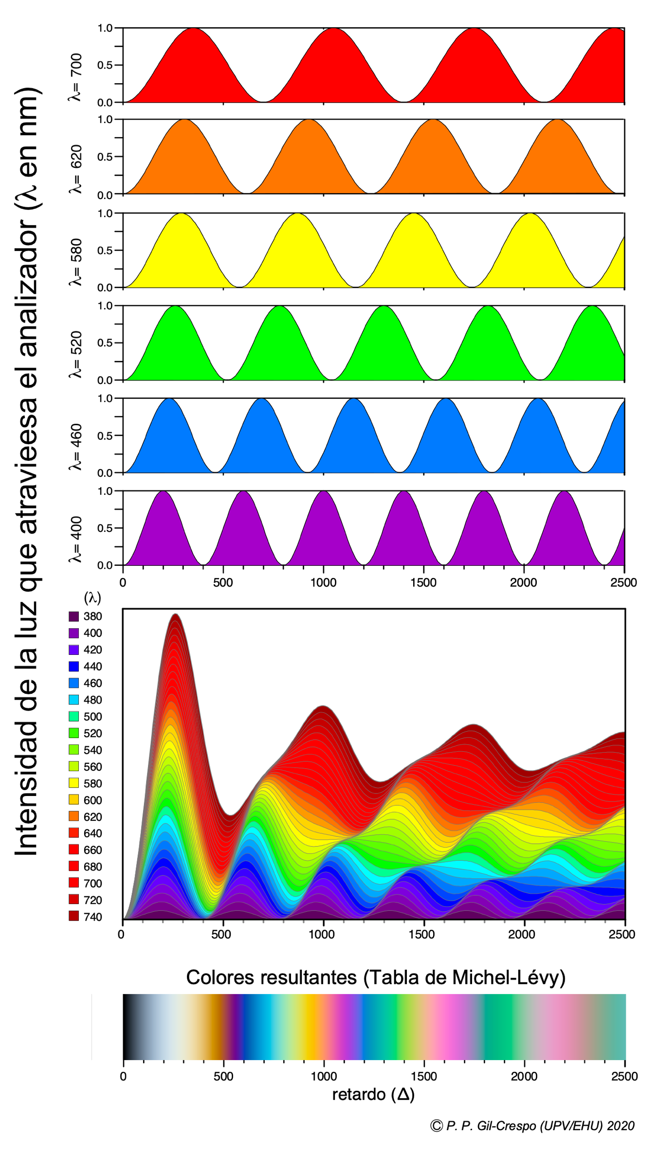 Arriba: diferencias de transmisión y absorción en el segundo polarizador, para las longitudes de onda de los colores básicos, en función de sus longitudes de onda y del retardo. Centro: distintas proporciones, de cada longitud de onda, que atraviesan el analizador para cada valor de retardo. Abajo: en la tabla de Michel-Lévy se ordenan todos los posibles colores de interferencia, originados por las distintas proporciones de cada longitud de onda que atraviesan el analizador.