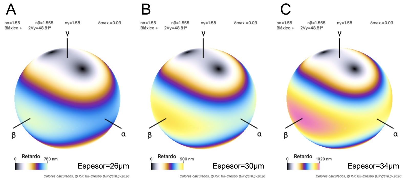 En las indicatrices biáxicas (C y D), la distribución de colores de interferencia es más compleja debido a que tenemos tres índices de refracción principales y dos ejes ópticos. En estos casos la sección de mayor birrefringencia y, por lo tanto de mayor retardo, es la que contiene a los dos ejes ópticos (plano óptico) y el mayor color de interferencia se observa en los rayos de luz que atraviesan el mineral perpendicularmente a esta sección. Las secciones de menor birrefringencia (retardo = 0) son las perpendiculares a los ejes ópticos.