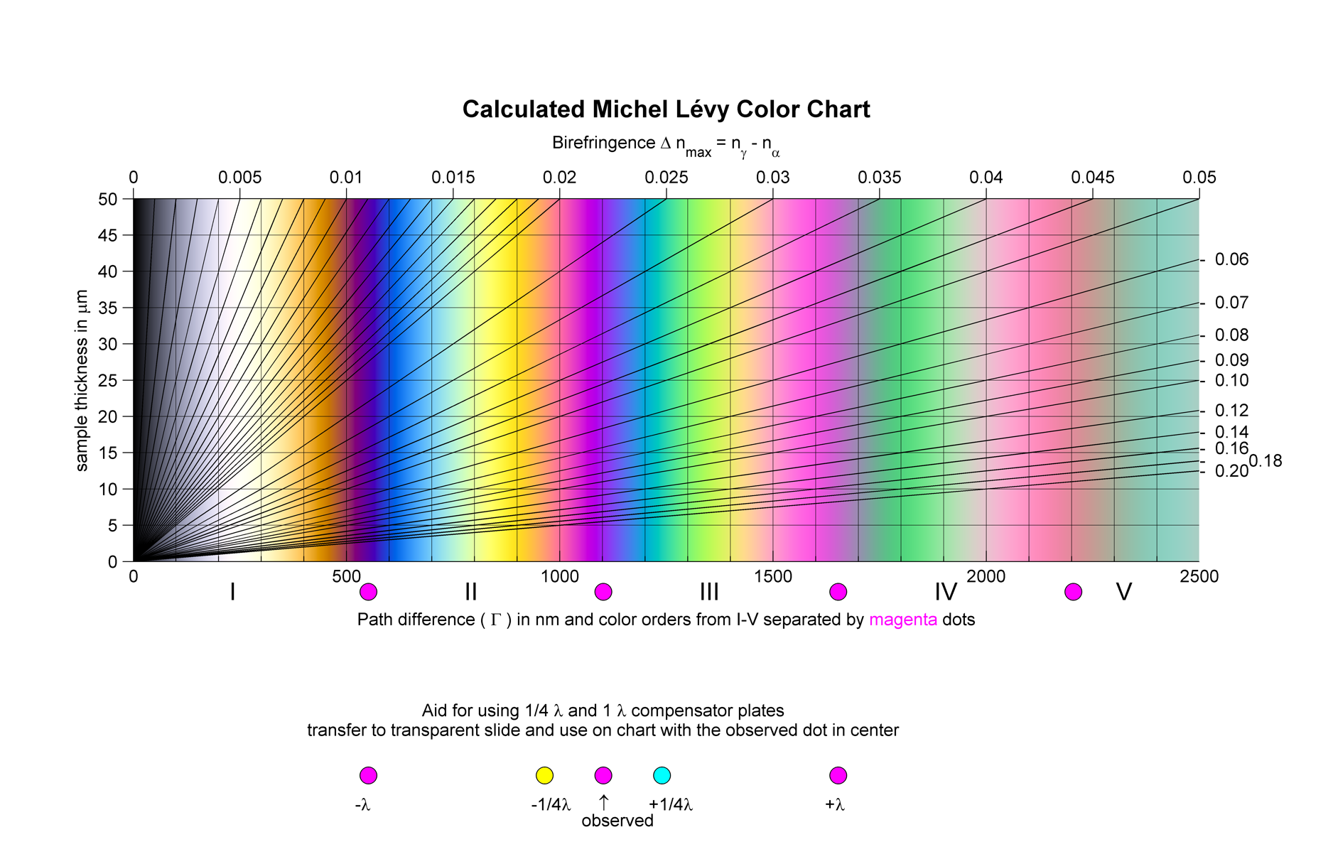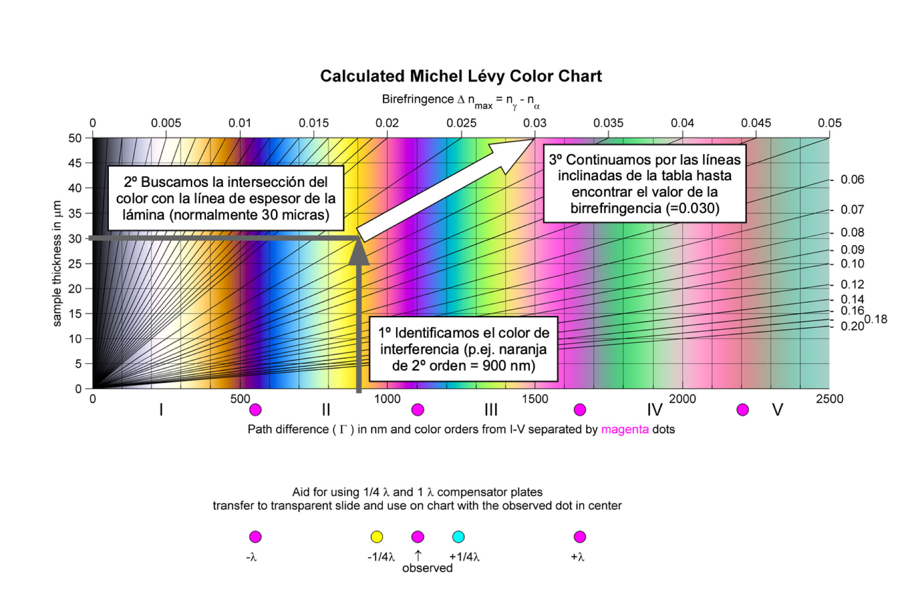 Para determinar la birrefringencia de un mineral debemos de conocer el retardo generado entre el rayo rápido y el rayo lento. Para ello necesitamos identificar el color de interferencia del mineral. A partir de este color y conociendo el espesor de la lámina delgada (normalmente 30µm), utilizamos la tabla de Michel-Lévy para estimar la birrefringencia.