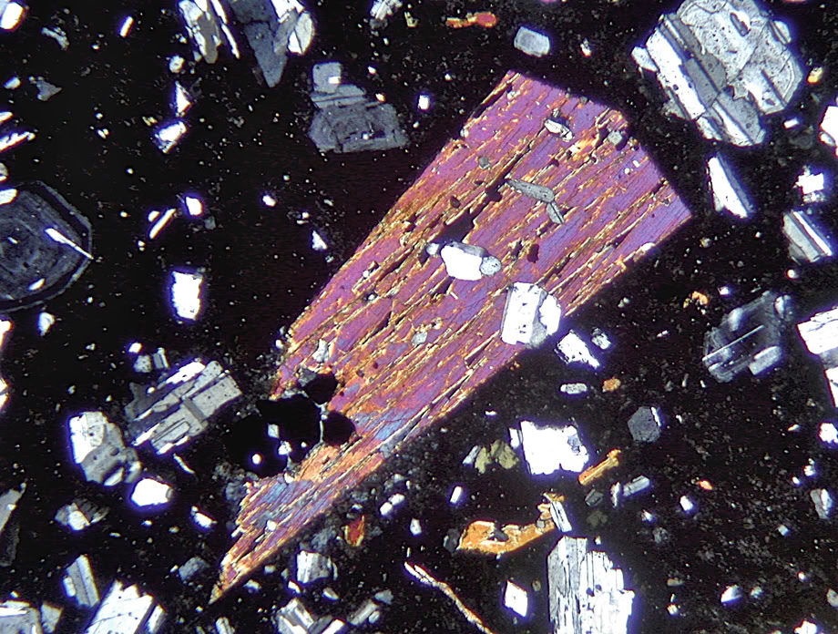 Colores de inteferencia rojos-azules del principio del 2º orden (birrefringencia media= 0.018-0.020) en cristales automorfos de hornblenda. Polarizadores cruzados.