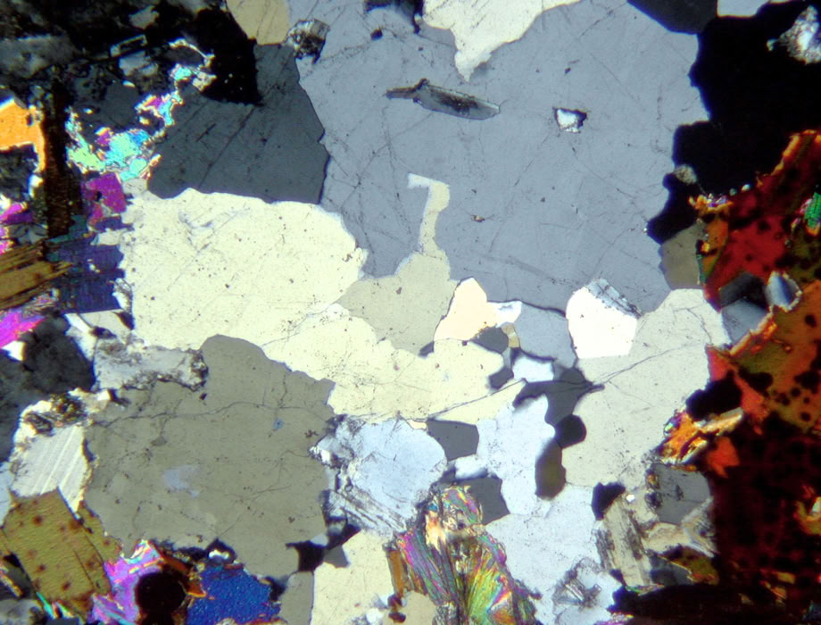 Colores de inteferencia bajos, gris-blanco de primer orden (birrefringencia baja= 0.009) en cristales xenomorfos de cuarzo. Polarizadores cruzados.