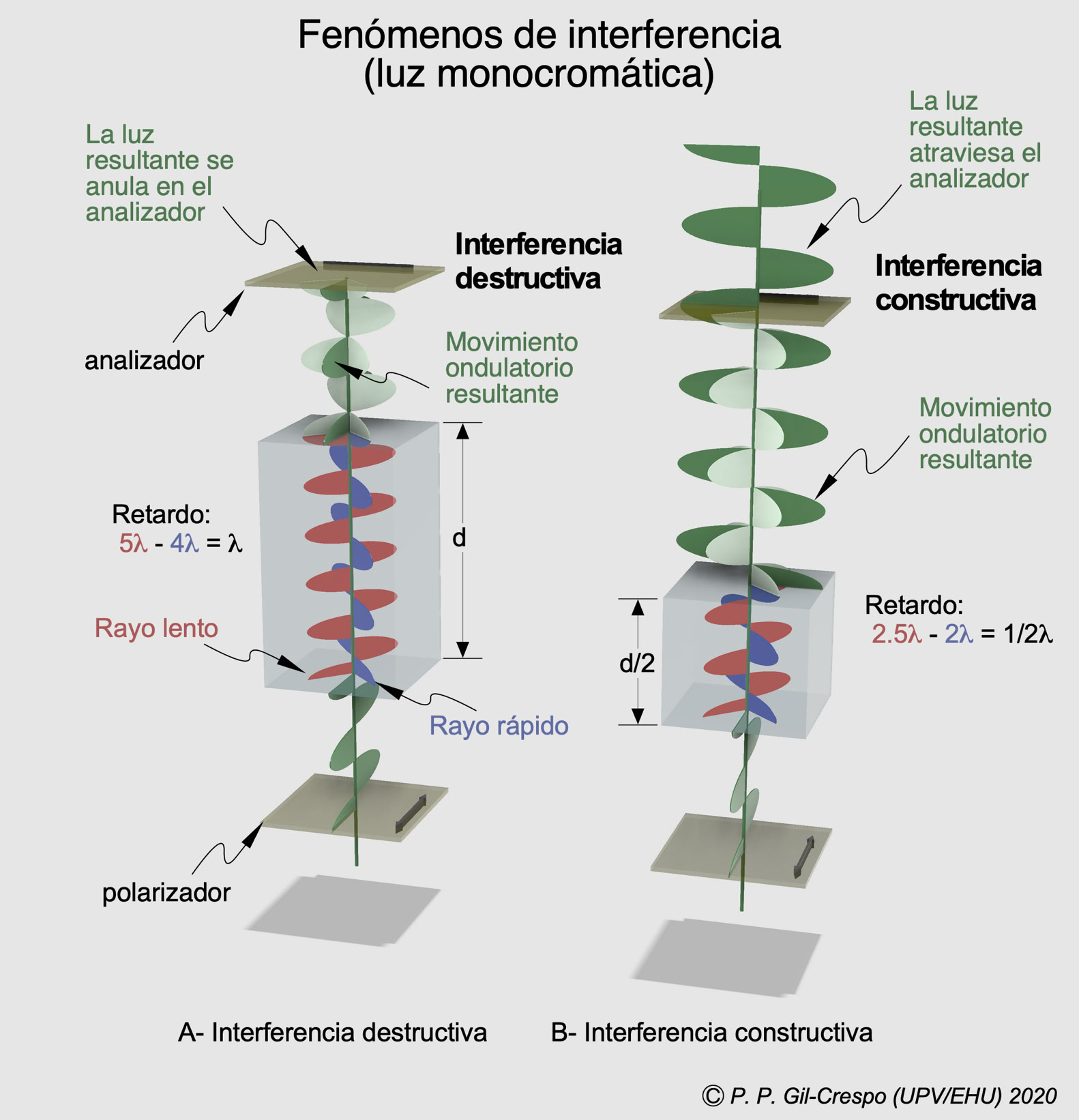 Si consideramos un rayo de luz monocromática (de λ = cte.) que atraviesa un medio anisótropo, los dos rayos polarizados alcanzan el segundo polarizador y pueden dar lugar a interferencias destructivas o constructivas con dos posibilidades extremas (ver figura):