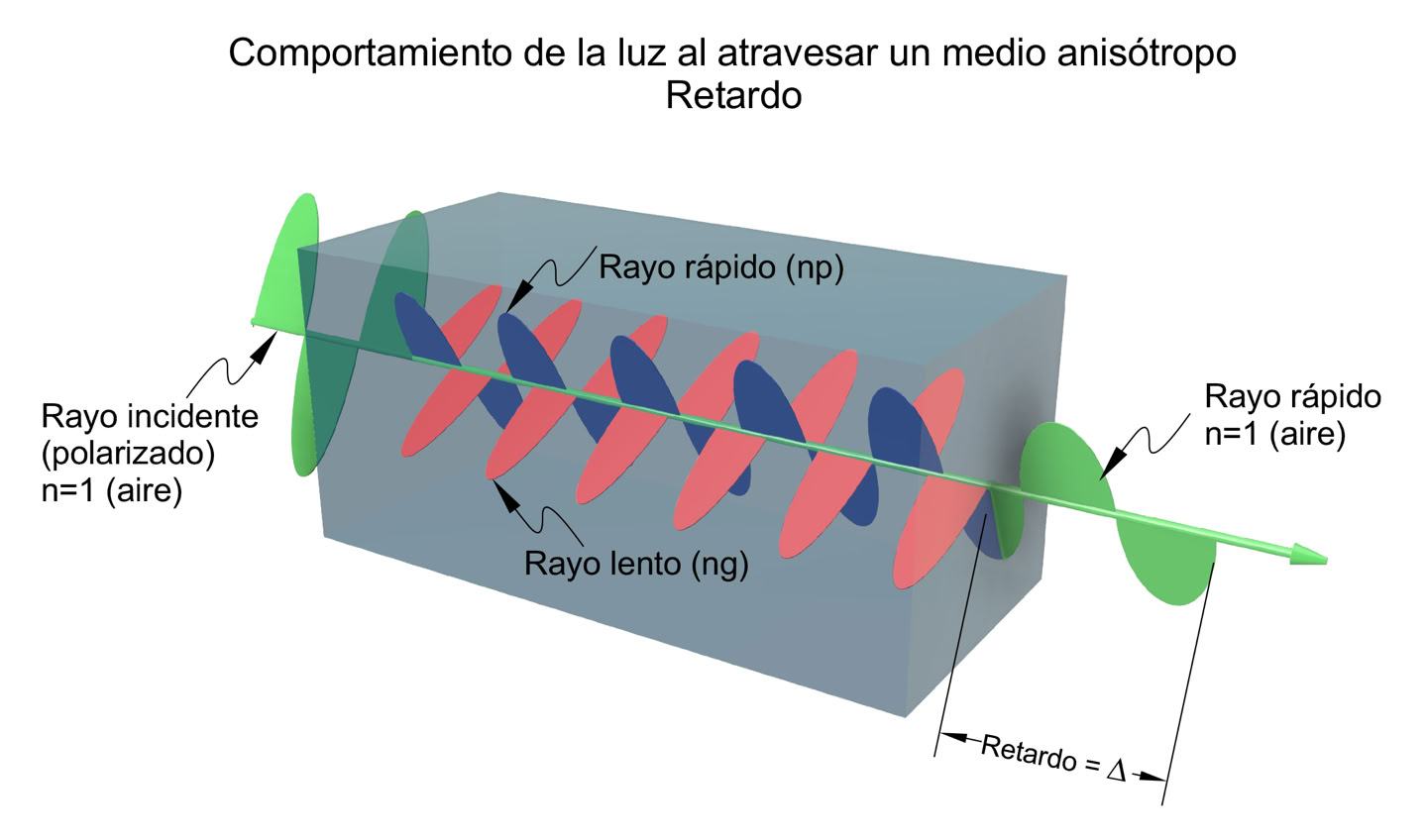 Durante el tiempo que el rayo lento atraviesa el medio anisótropo el rápido ha conseguido una ventaja sobre el lento que se denomina retardo (Δ). Una vez que los dos rayos polarizados han atravesado el medio anisótropo mantienen el retardo y continúan como dos rayos perpendicularmente polarizados que vuelven a transmitirse a la misma velocidad. La relación entre el retardo (Δ), el espesor del mineral (d) y la birrefringencia (ng-np) viene dada por la relación: