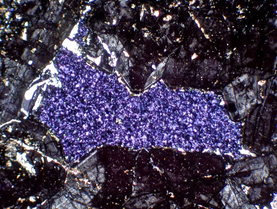 Colores de interferencia anómalos ultra-azules (no se corresponden con los de la tabla de Michel-Leví), en cristales de clorita (la birrefringencia es baja). Polarizadores cruzados.