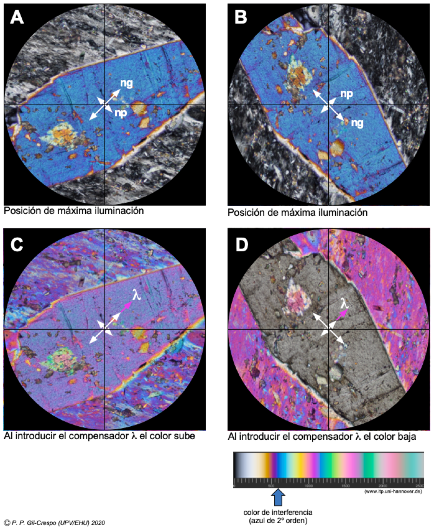 Partimos de la posición de extinción del mineral, en la cual las dos direcciones de vibración preferentes coinciden con las direcciones de los polarizadores. Al girar un grano a 45º de la posición de extinción (ver Figura: A y B) tendremos uno de dos rayos polarizados colocado en la posición de retardo de los compensadores (a 45º del N-S del microscopio y el otro a 90º de este). Si, con el mineral en esta posición, introducimos el compensador λ, el rayo que vibra en la dirección de 45º se verá retardado en una cantidad igual a 530 nm, con los que el color de interferencia del grano variará. Tenemos dos posibilidades: a) que el rayo colocado en la posición de retardo sea el lento (el de indice de refracción mayor=ng) y, en este caso, al retardar al rayo lento aumentaremos el retardo total con lo que el color de interferencia subirá (ver Figura: A y C), b) si el color de interferencia baja (ver Figura: B y D) nos indica que estamos retardando al rayo más rápido (el de indice de refracción menor=np). Decimos que el color sube cuando el color de interferencia se desplaza a hacia colores de ordenes superiores (hacia la derecha de la tabla de Michel-Lévy) y baja cuando el desplazamiento es hacia órdenes inferiores (hacia la izquierda de la tabla).