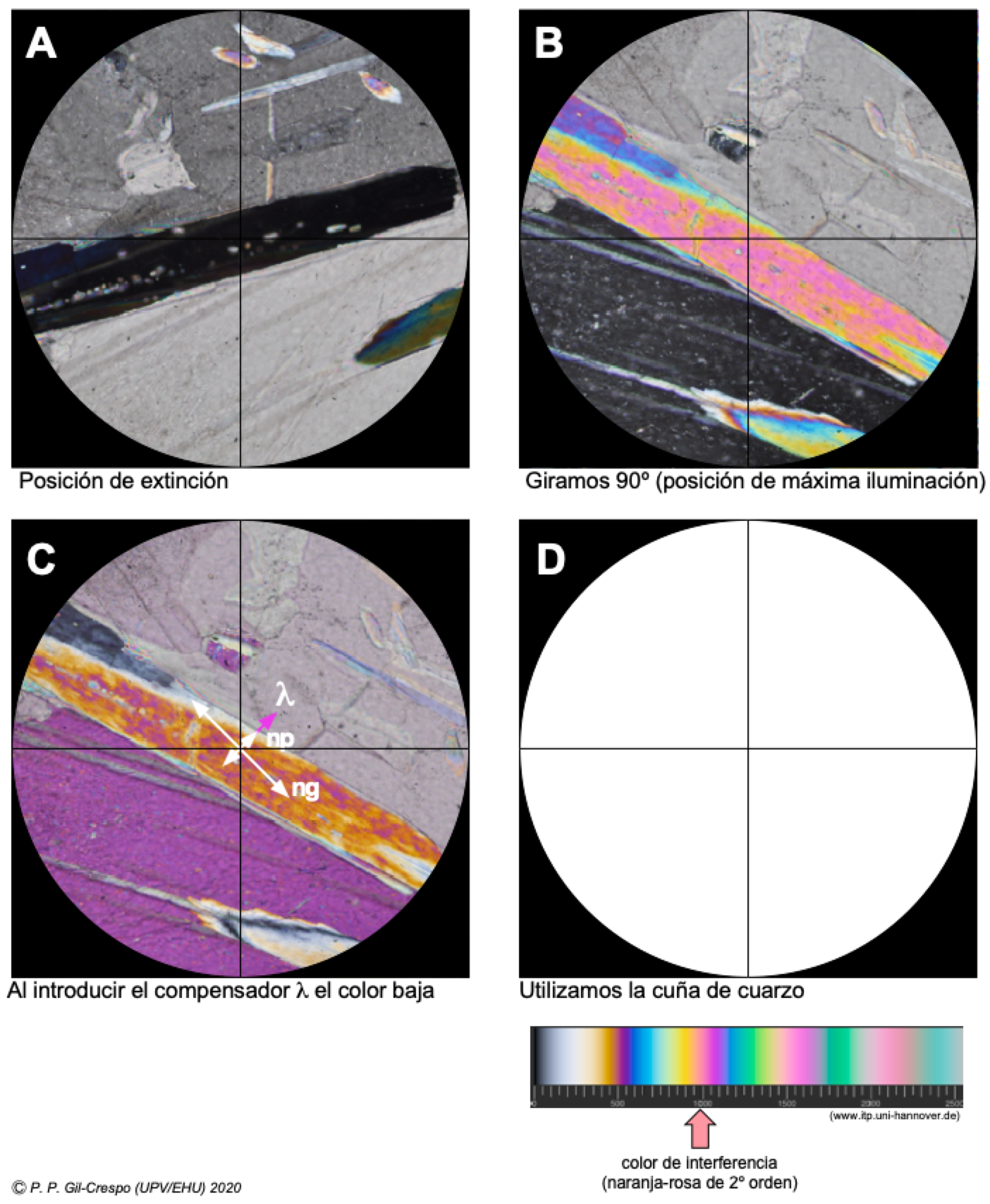 Identificación del color de interferencia utilizando la cuña de cuarzo. Partimos de la posición de extinción (A) y giramos 45 ª para encontrar el color de interferencia en la posición de máxima iluminación (B). Como al introducir el compensador λ el color baja (C), introducimos lentamente la cuña de cuarzo (D, vídeo en bucle) hasta encontrar un color gris. Retiramos la lámina delgada, e identificamos el color de interferencia obtenido. En este ejemplo, al extraer la cuña de cuarzo el color naranja-rosa se repite una vez, por lo que color que tenemos es de 2º orden.