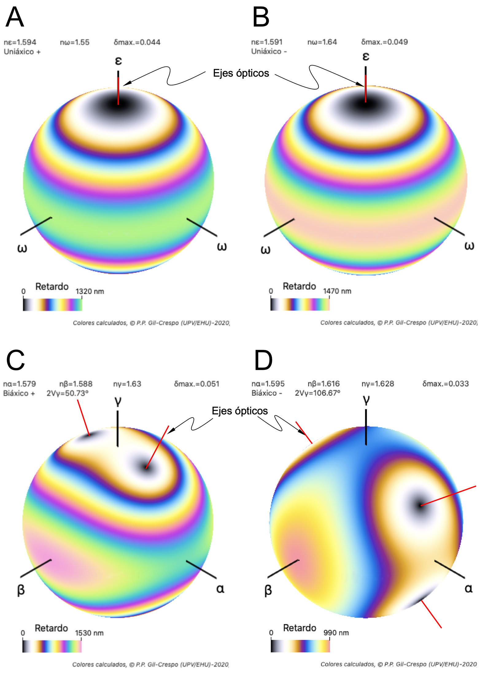 Ejemplos de curvas de “iso-birrefringencia” en indicatrices ópticas anisótropas: A = uniáxico positivo, B = uniáxico negativo, C = biáxico positivo y C = biáxico negativo. Colores de interferencia calculados para un espesor de 30 micras (δmax. = birrefringencia máxima).