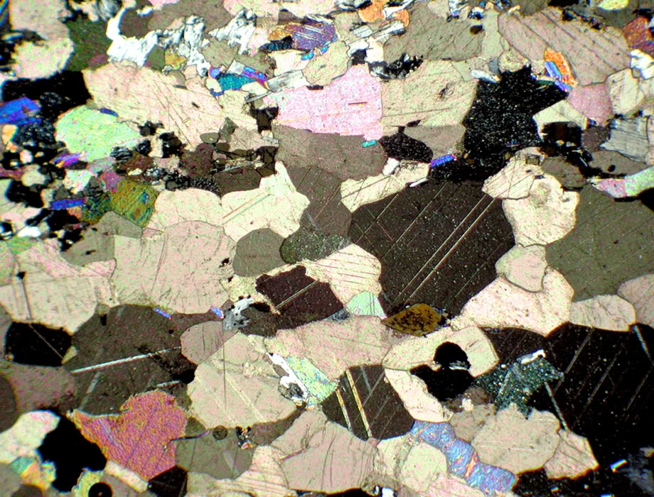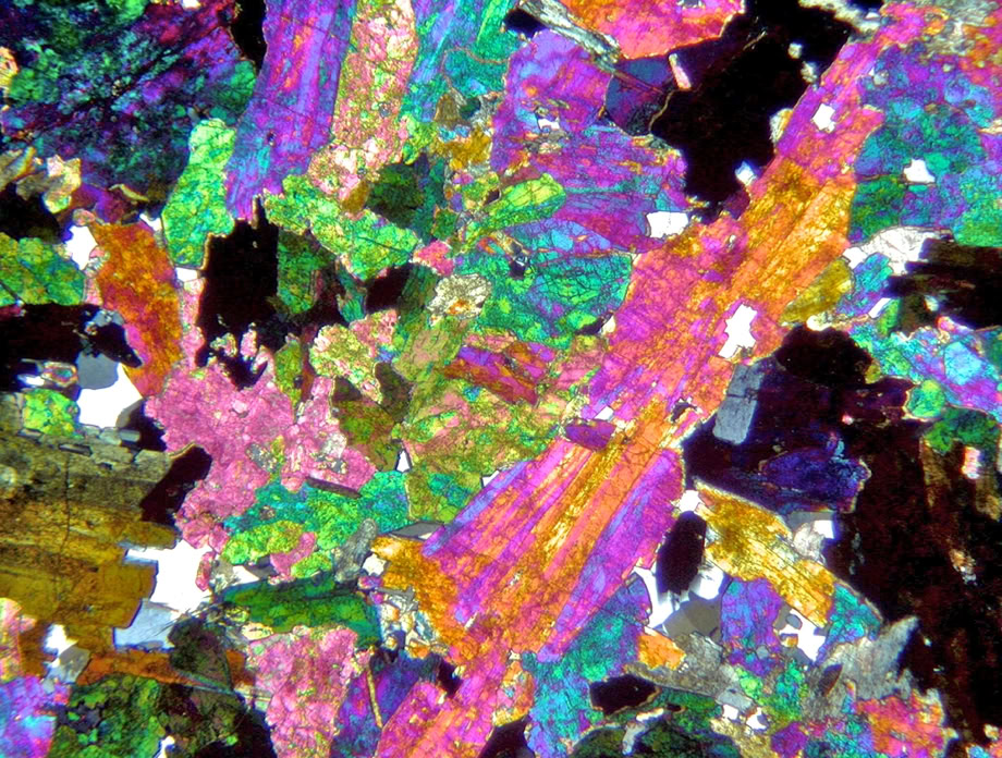 Cristales de diópsido, la variación en los colores de interferencia se debe a las diferentes orientaciones de las secciones de los cristales.