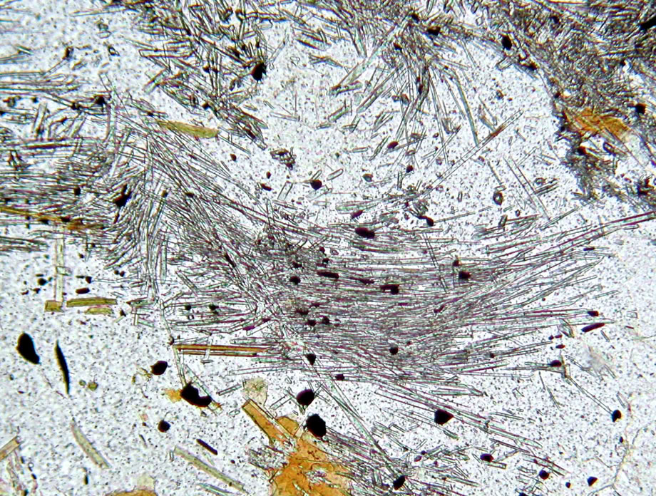 Cristales subautomorfos (alargados pero sin caras bien definidas) de actinolita en un skarn. Luz polarizada plana.