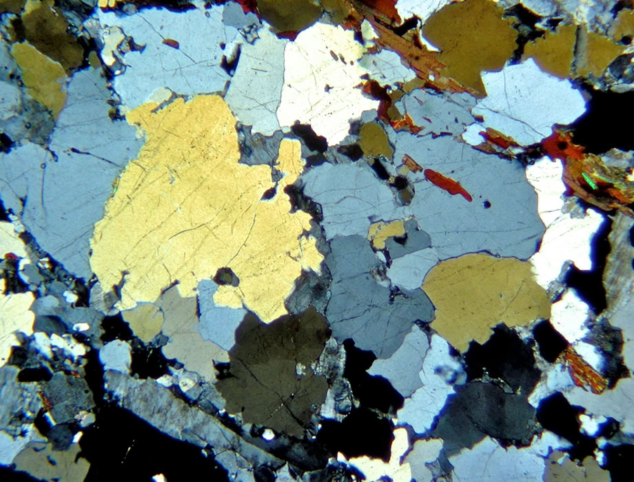 Granos xenomorfos (ameboides) de cuarzo. Polarizadores cruzados.