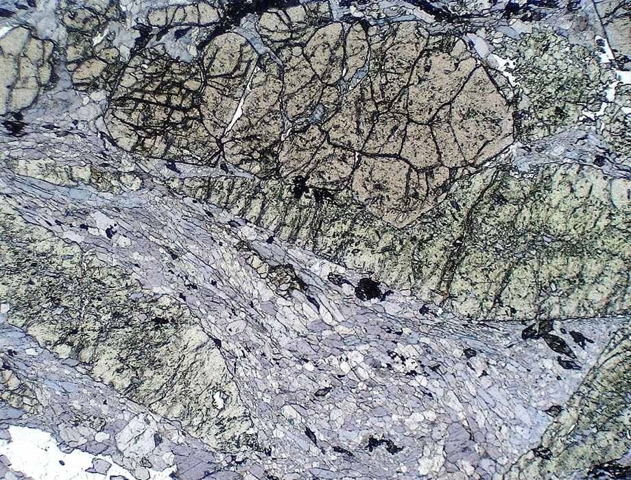 Glaucofana en una eclogita (epidota, granate y rutilo).