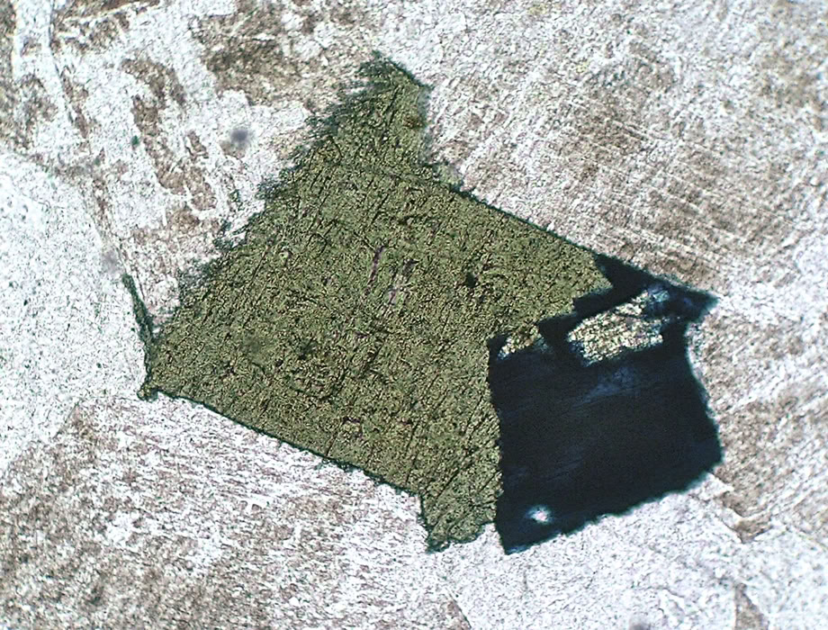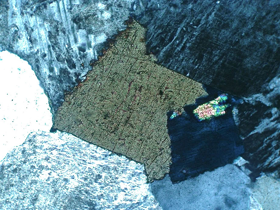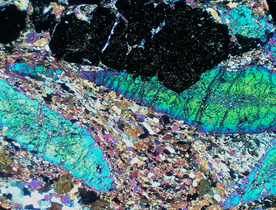 Misma zona, con polarizadores cruzados. Los colores de interferencia (bajos) quedan enmascarados por el intenso color del mineral.