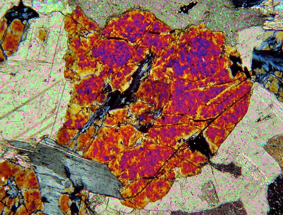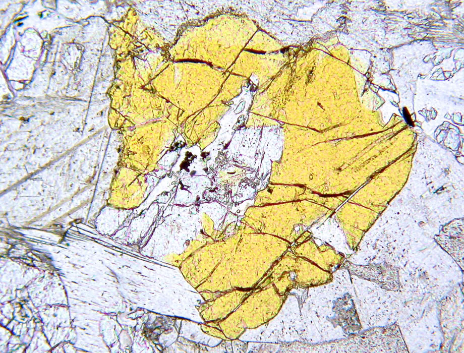 Mineral del grupo de la humita (posiblemente clinohumita) en un mármol (calcita, tremolita, clorita, flogopita, granate, diópsido, fosterita).