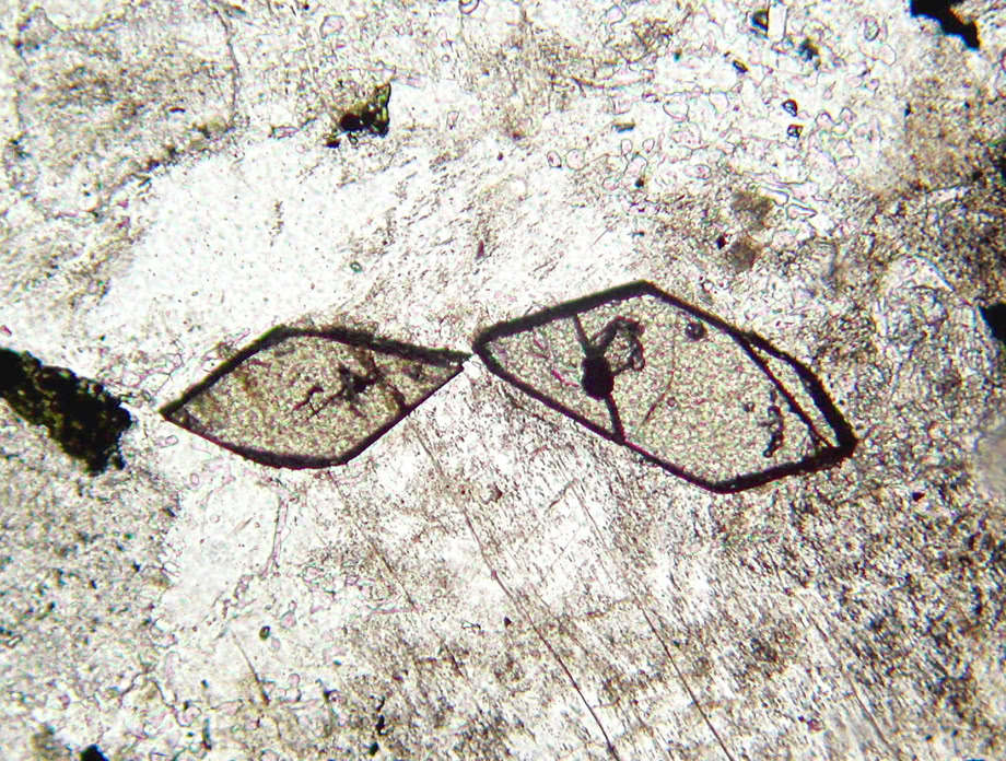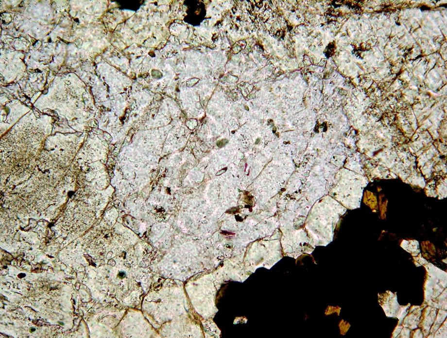 Pleocroísmo de relieve. En la calcita del ejemplo el relieve varía desde un relieve medio negativo a un relieve alto positivo, lo que de aprecia al girar la muestra en el microscopio. Es característico de los carbonatos. Luz polarizada plana.