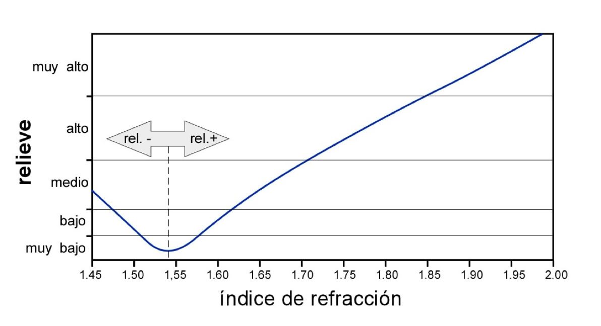 Variación (aproximada) del relieve con el índice de refracción, a valores de n muy bajos el relieve es negativo (muy bajo, bajo o medio).
