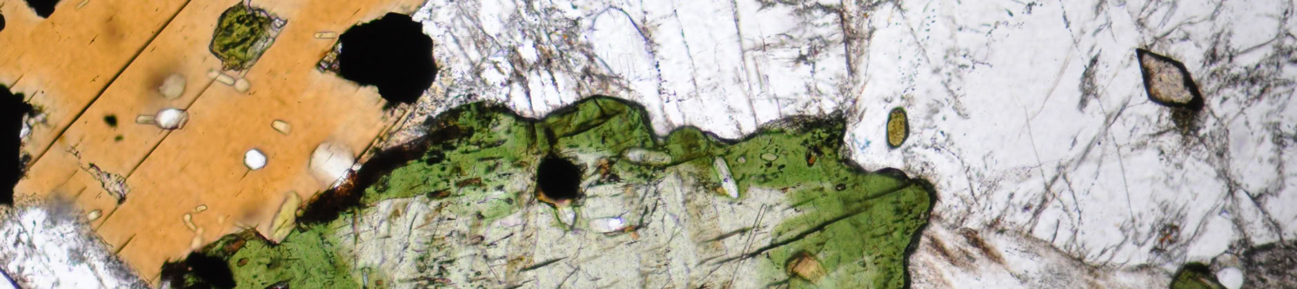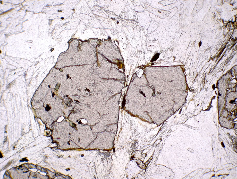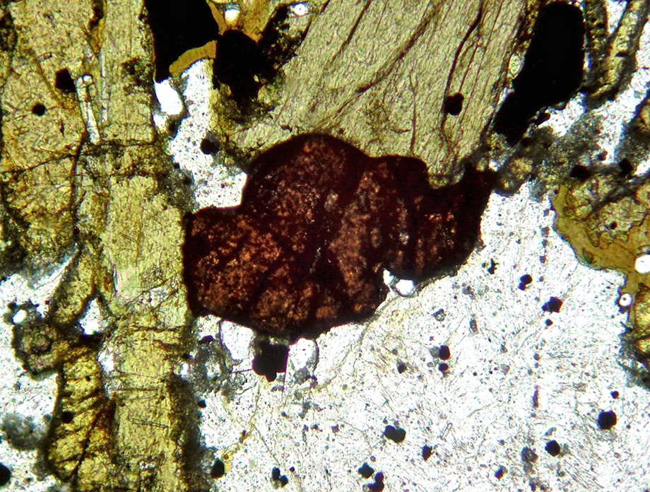 Relieve medio, en la turmalina tipo chorlo (n= 1.64-1.67) los límites de grano se aprecian con claridad. Luz polarizada plana.