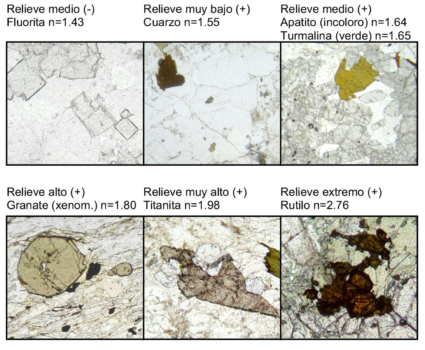 Ejemplos de minerales con diferente relieve, ordenados de menor a mayor índice de refracción.