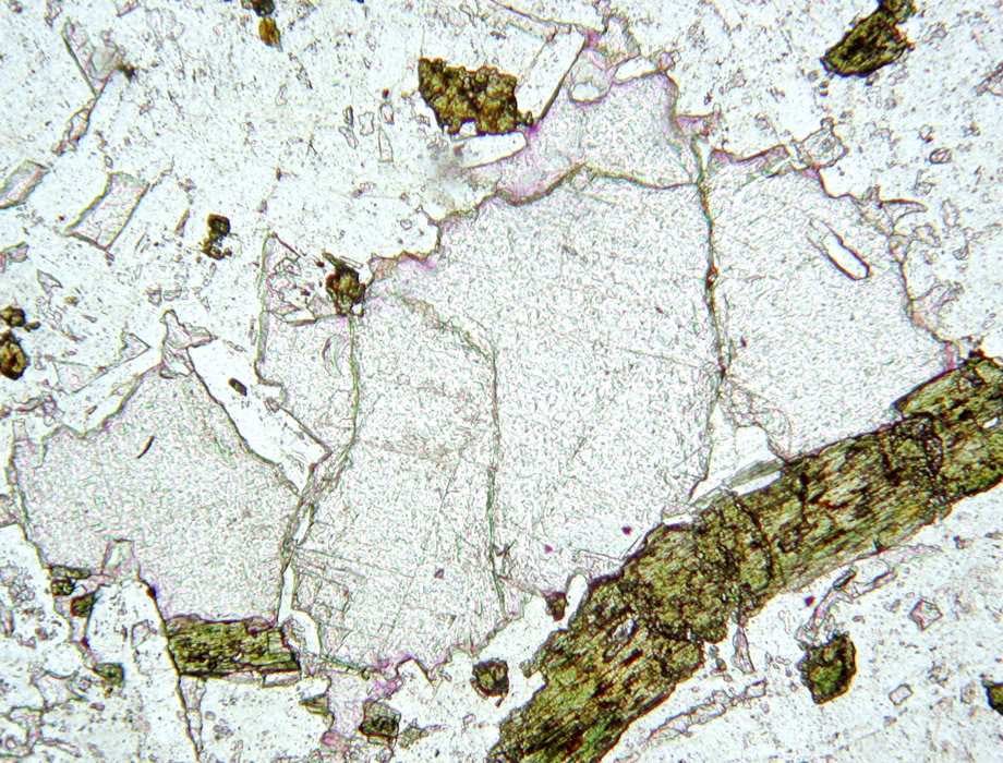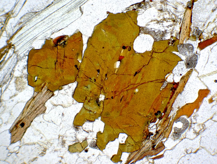 Relieve medio (positivo), en la biotita (n= 1.6-1.7) los límites de grano se aprecian con claridad. Luz polarizada plana.