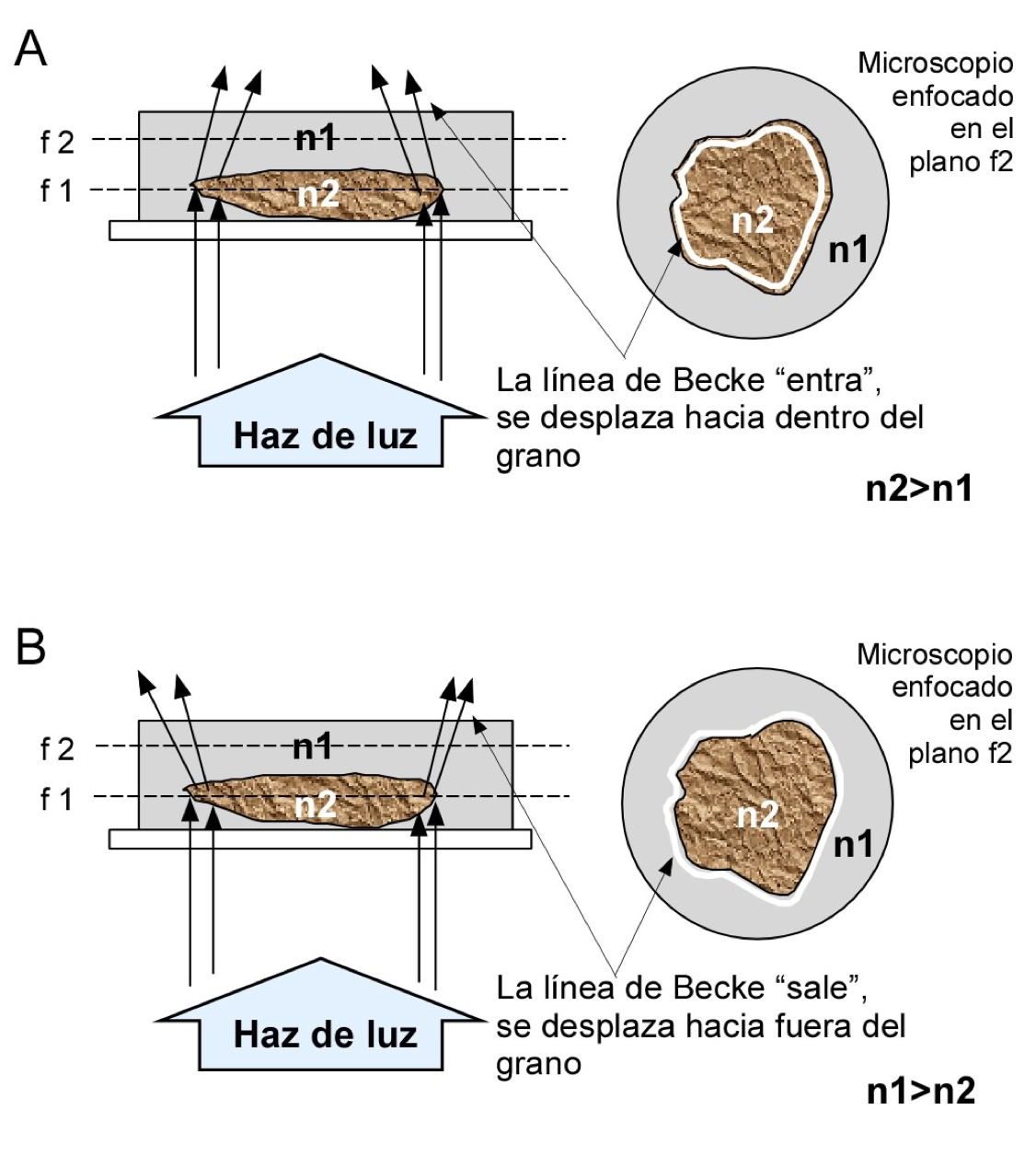 Comportamiento de la línea de Becke en un mineral sumergido en una gota de aceite de inmersión. En A la línea de Becke “entra” hacia el mineral (al enfocar en el plano), ya que presenta mayor índice de refracción que el aceite; en B, la línea de Becke “sale” hacia el aceite (con mayor índice de refracción que el mineral).