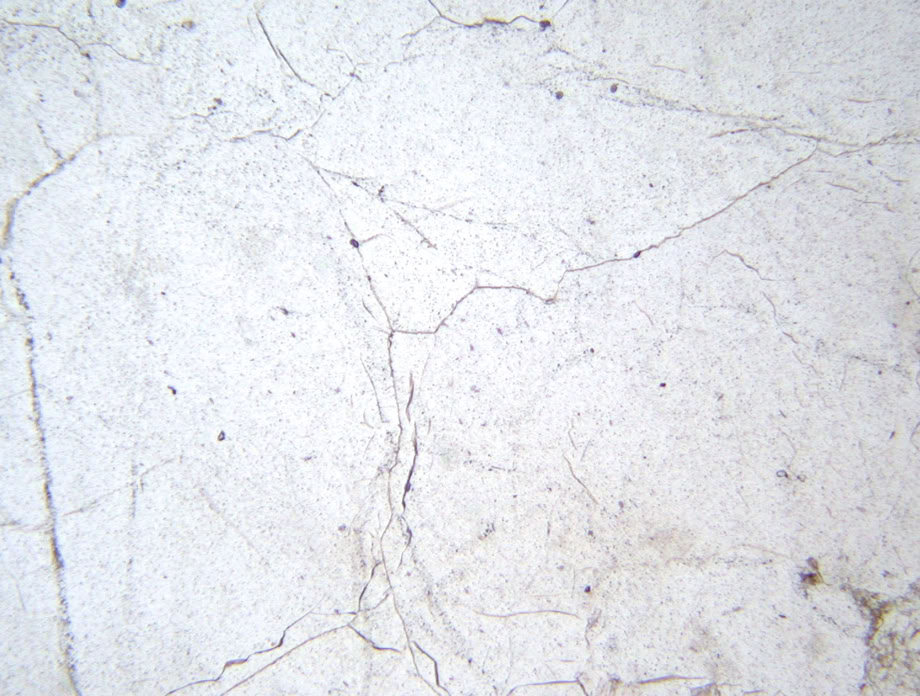 Relieve muy bajo positivo, en el cuarzo (n= 1.54-1.55) los límites de grano son casi imperceptibles. Luz polarizada plana.