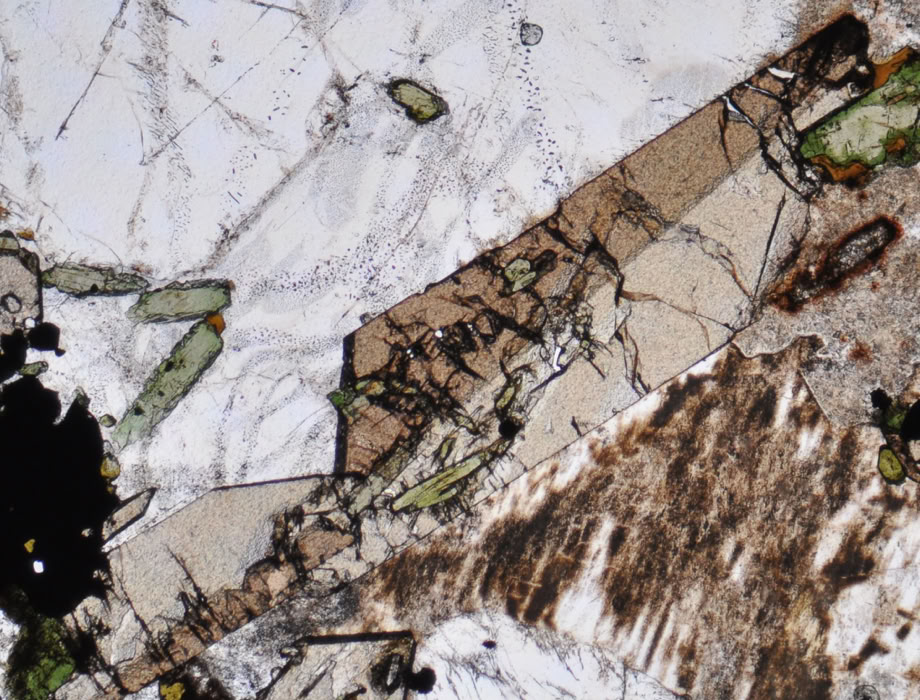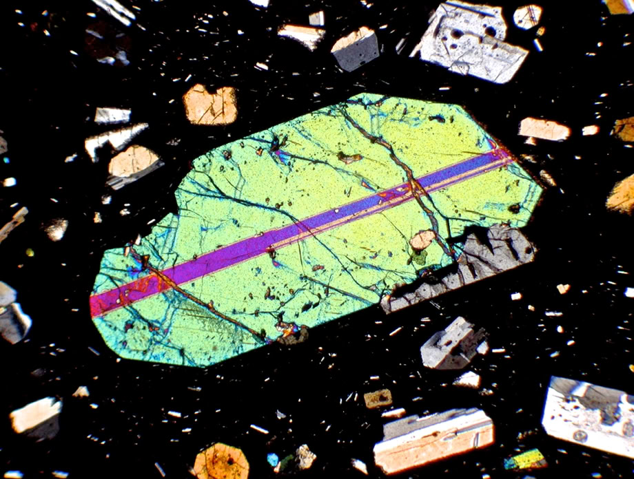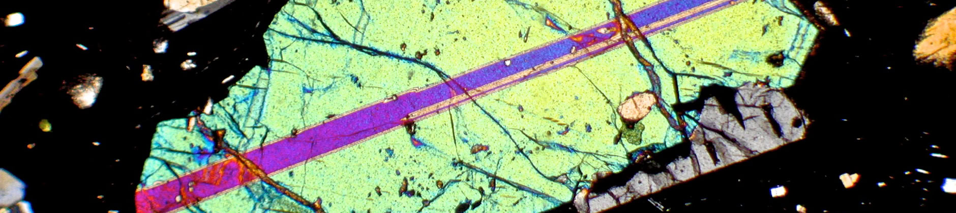 Maclas lamelares simples en un cristal automorfo de un clinopiroxeno tipo augita. Polarizadores cruzados.