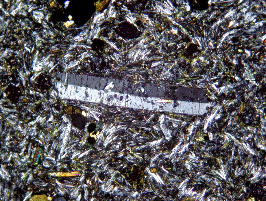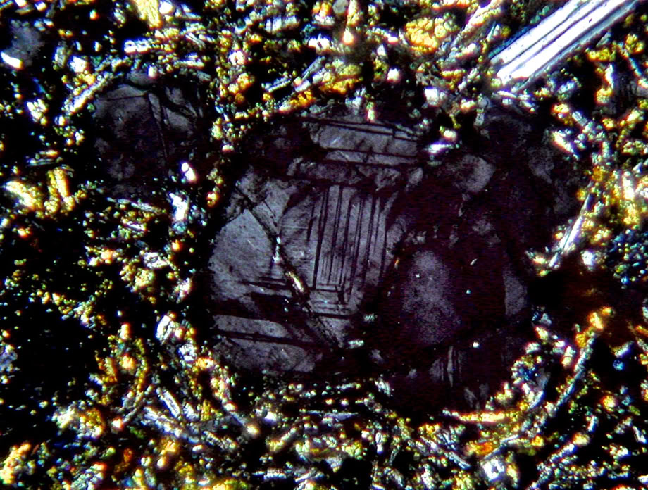 Maclado multidireccional en cristales de leucita. Las maclas son muy poco visibles debido a la baja birrefringencia de este mineral. Polarizadores cruzados.