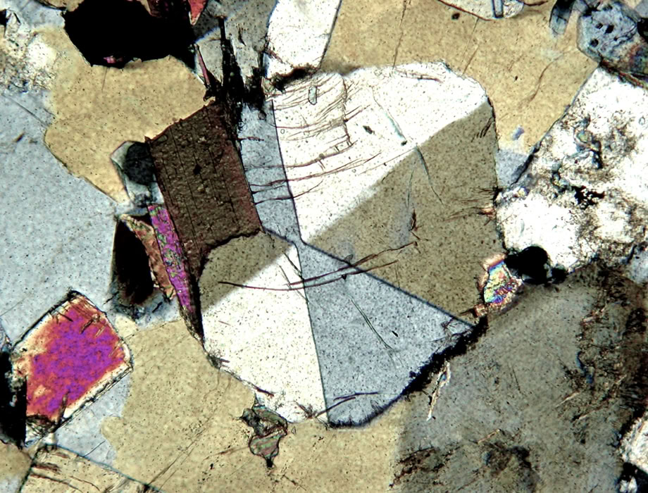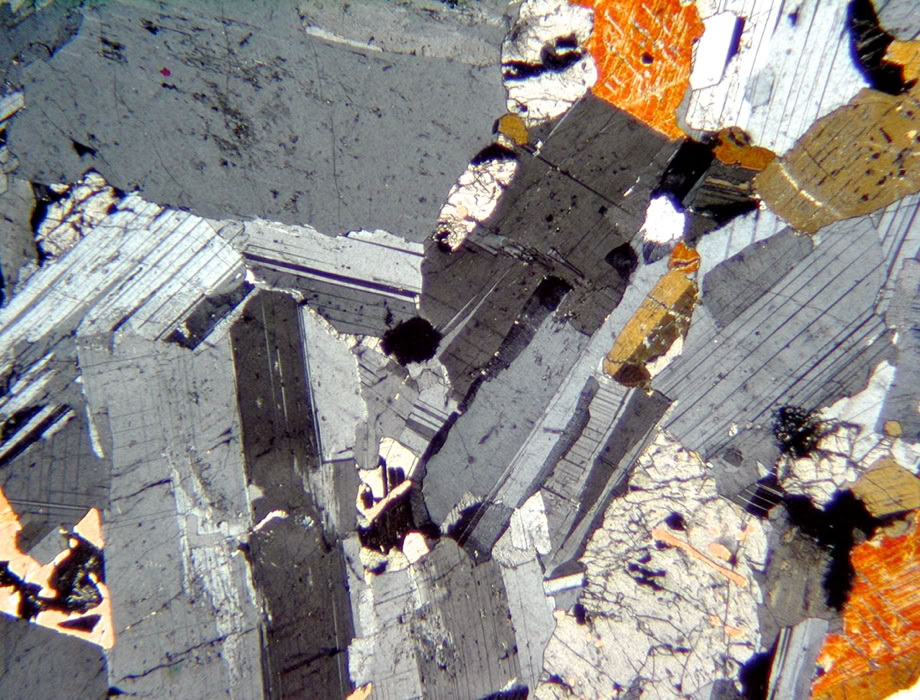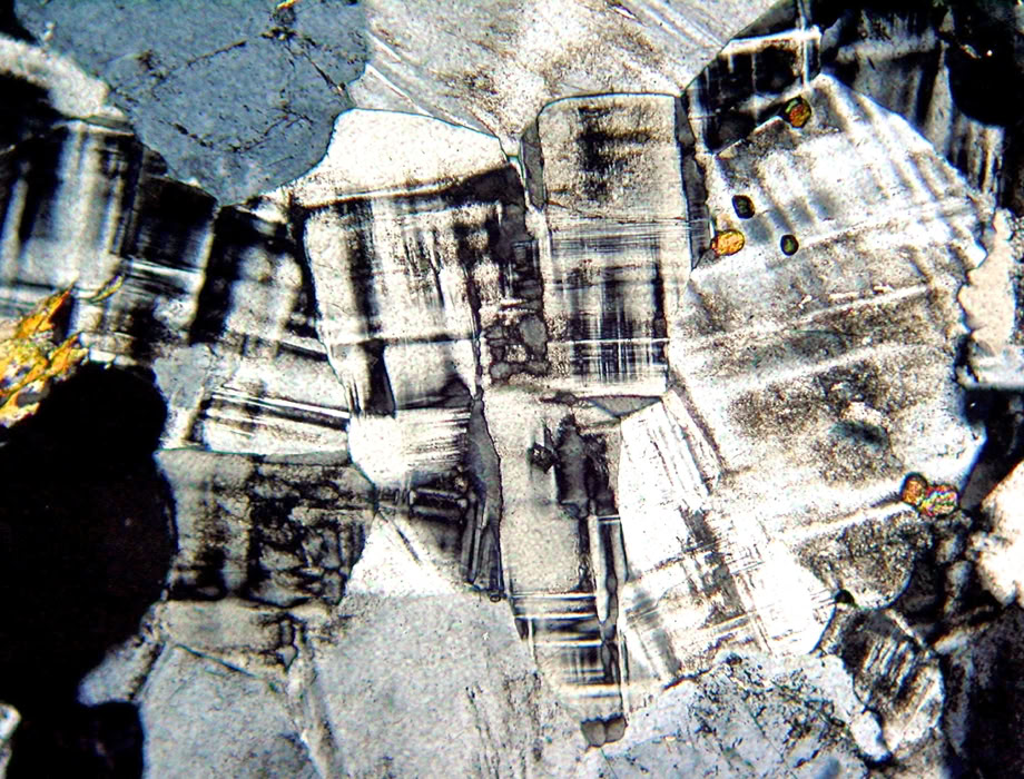 Maclas de enrejado (en tartán o tela escocesa) en diferentes granos de microclina. Polarizadores cruzados.
