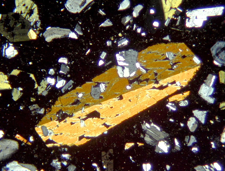 Macla simple en un cristal automorfo de hornblenda. Polarizadores cruzados.