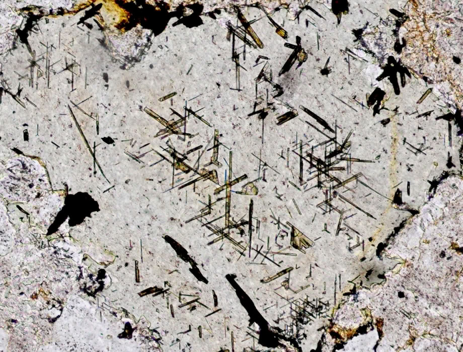 Macla cíclica de cristales de rutilo (sagenita), formando estrellas de seis puntas, en una biotita alterada a clorita.