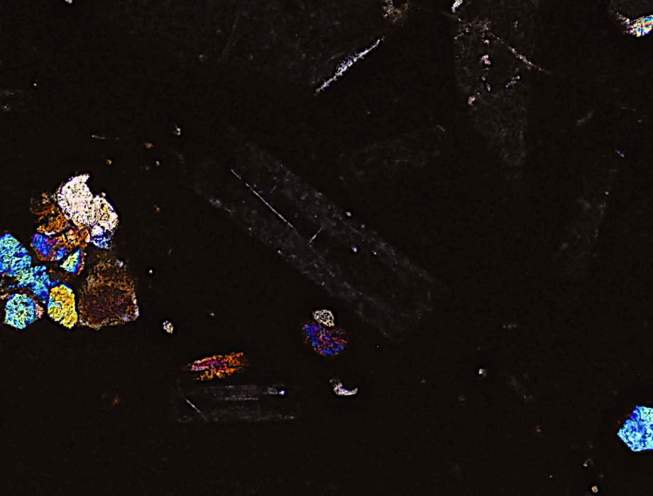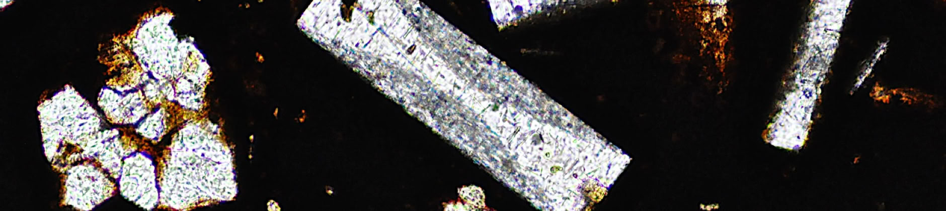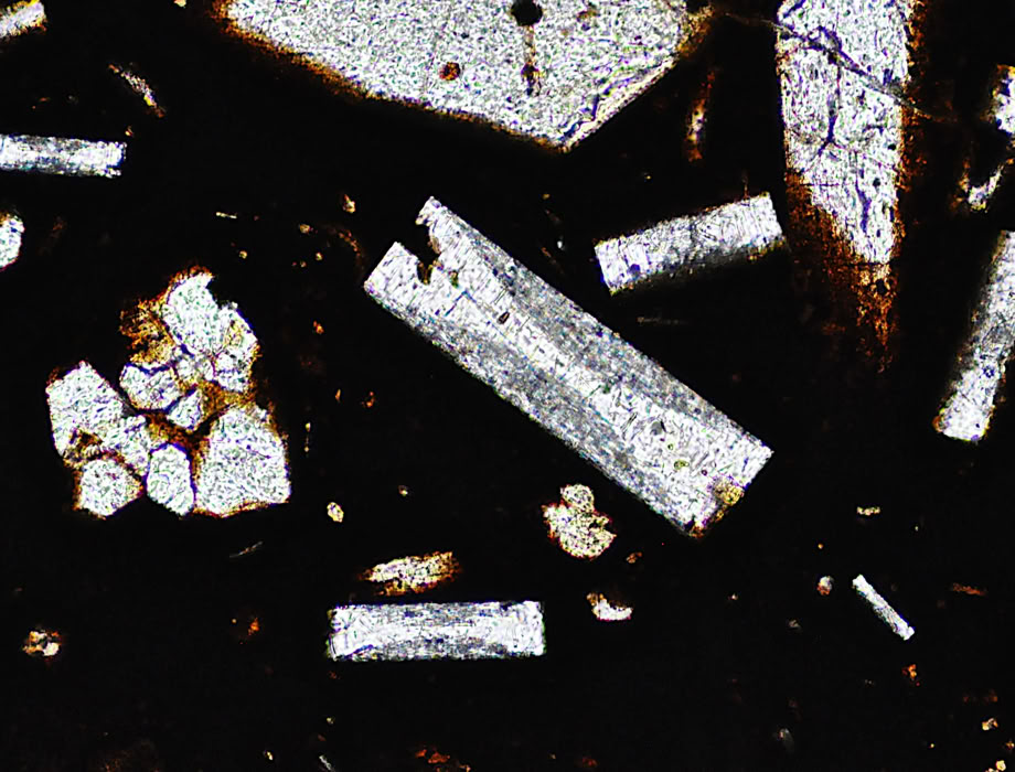 Cristales automorfos de melilita, con inclusiones mostrando un estructura “peg” en una roca volcánica ultabásica de tipo melilitita (olivino, augita y vidrio).