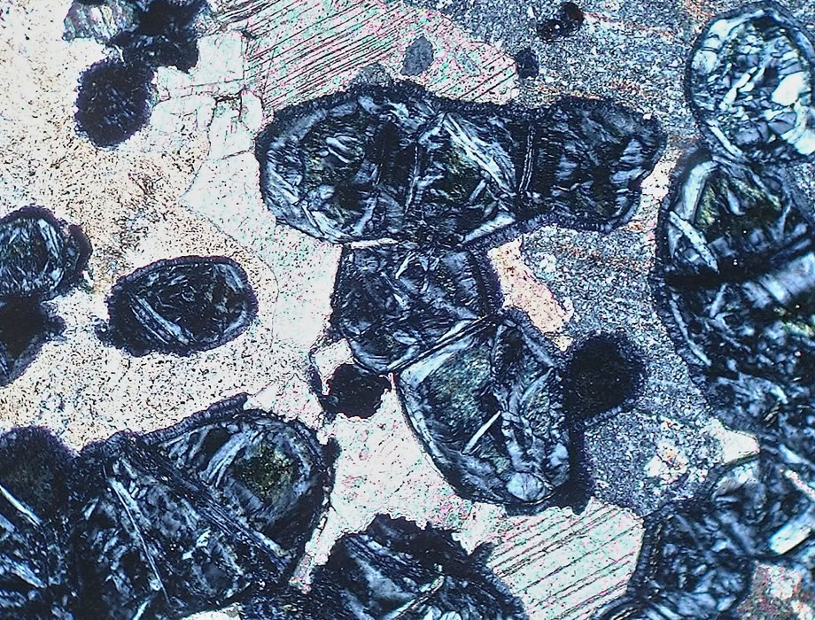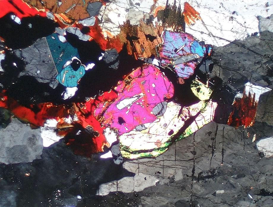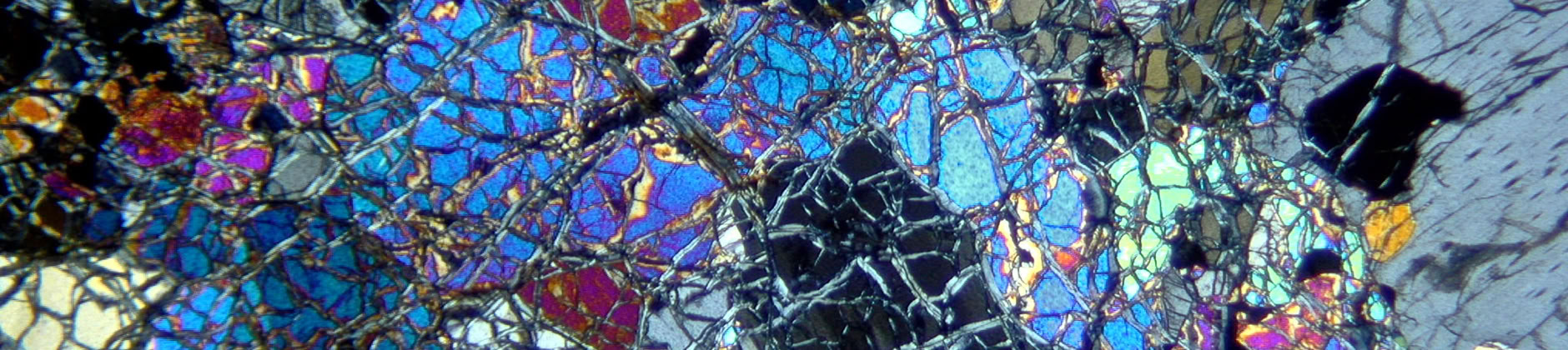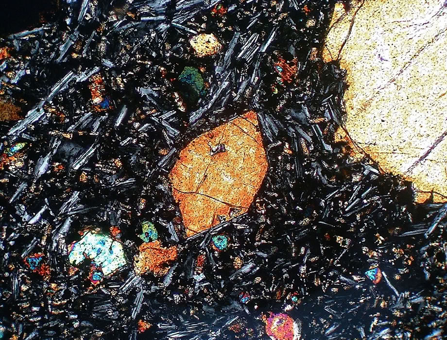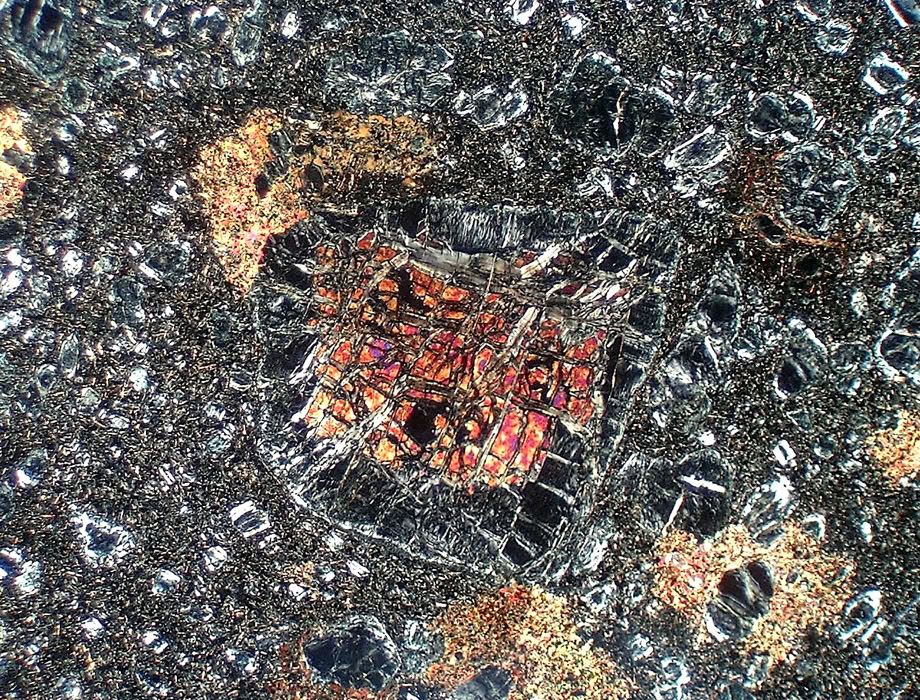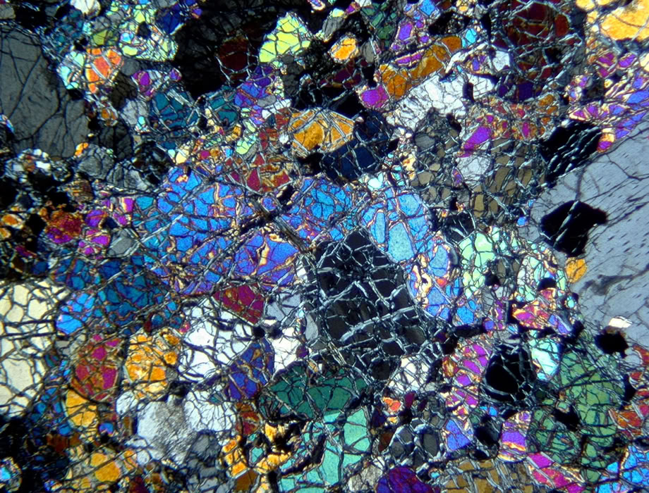Misma zona, con polarizadores cruzados. En los olivinos la birrefringencia (color de interferencia) aumenta con el contenido en Fe