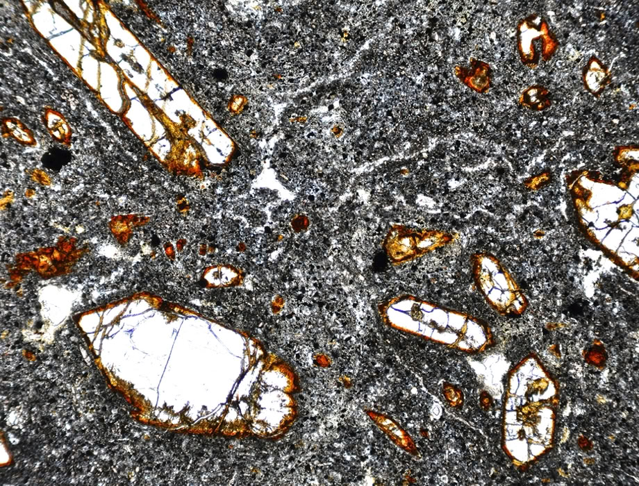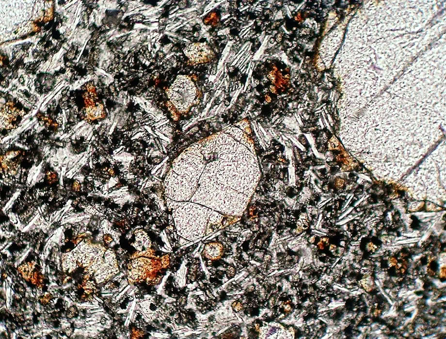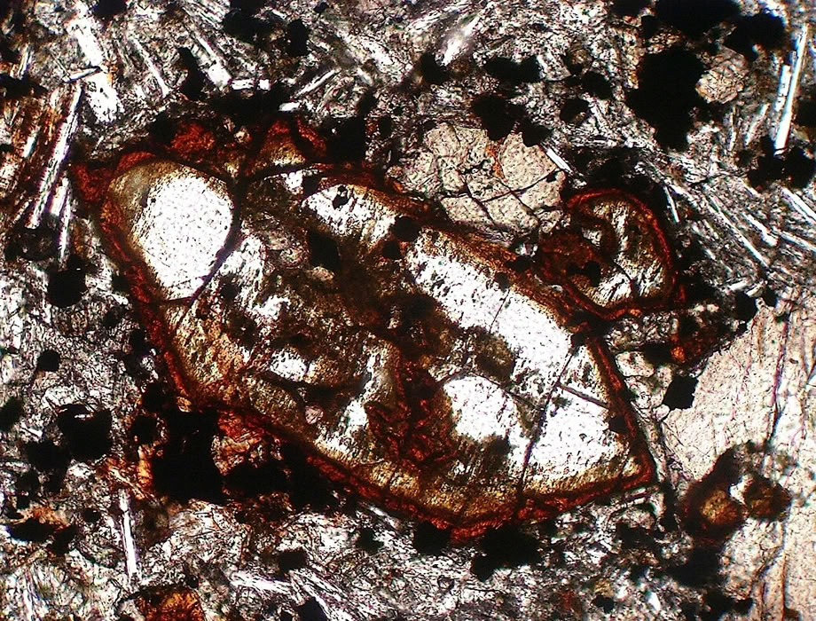 Olivino automorfo alterado a iddingsita en un basalto (plagioclasa, augita).