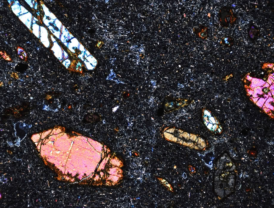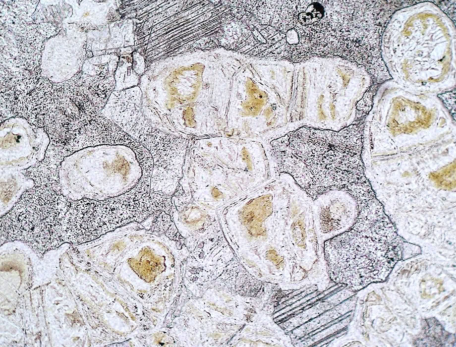 Olivinos automorfos ligeramente alterados, en un basalto (plagioclasa, augita, calcita y matriz microcristalina).