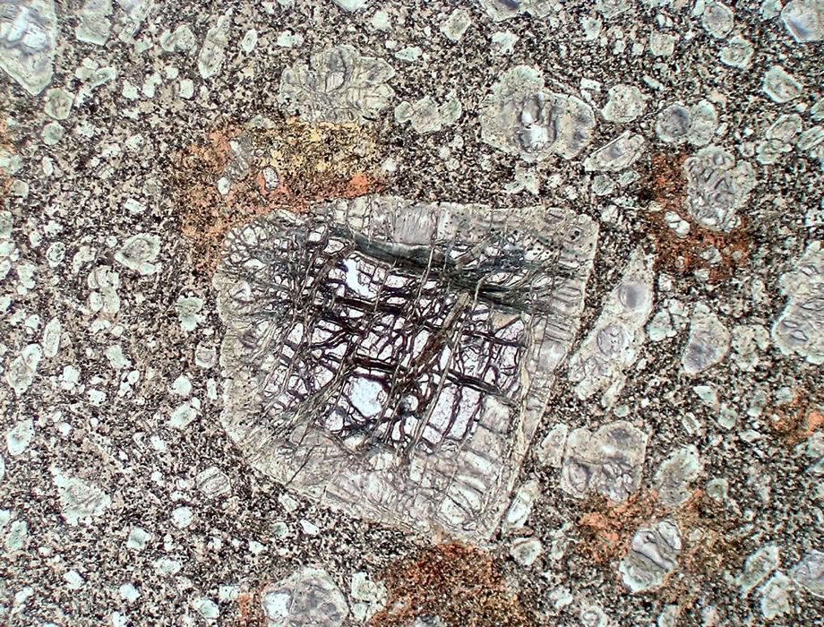 Olivino totalmente serpentinizado en un mármol (calcita, brucita).