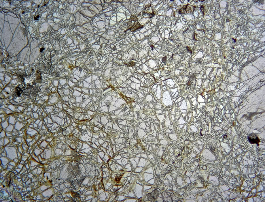 Olivino alterado parcialmente serpentinizado en una dunita (ortopiroxeno, cromita).