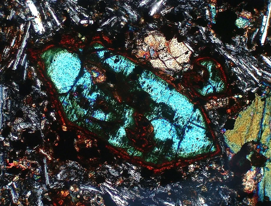Cristal automorfo de olivino inalterado en un basalto (plagioclasa, augita).