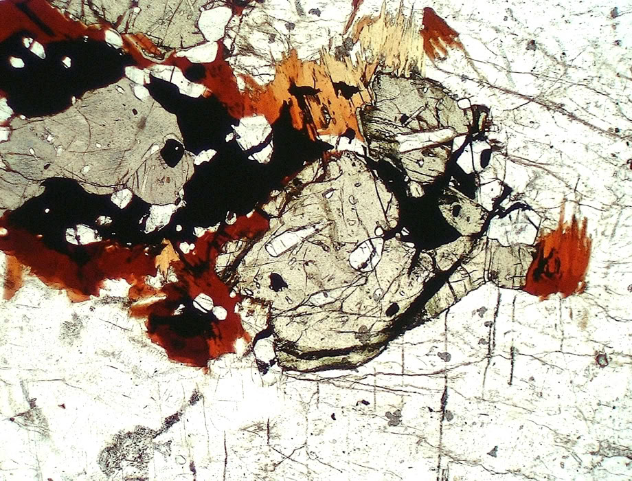 OTROS DATOS: Fracturas irregulares frecuentes. Se altera fácilmente a serpentina (más magnetita) comenzando por las fracturas. Otra forma de alteración es a iddingsita (mezcla de óxidos de Fe y otros minerales). Los términos próximos a la forsterita (Mg) son incoloros y con birrefringencia y relieve más bajos. En el extremo Mg de la serie el signo es B(+)
