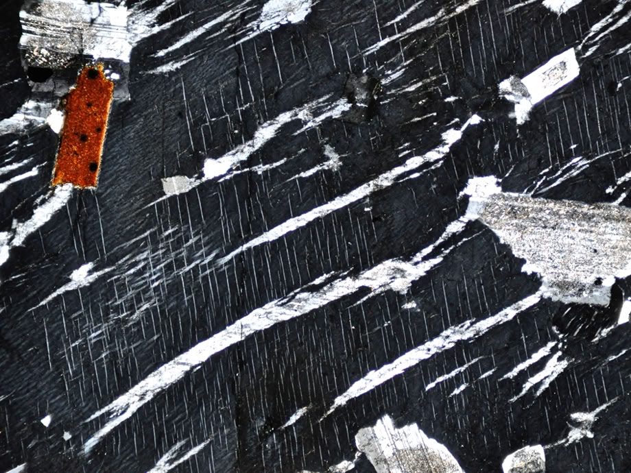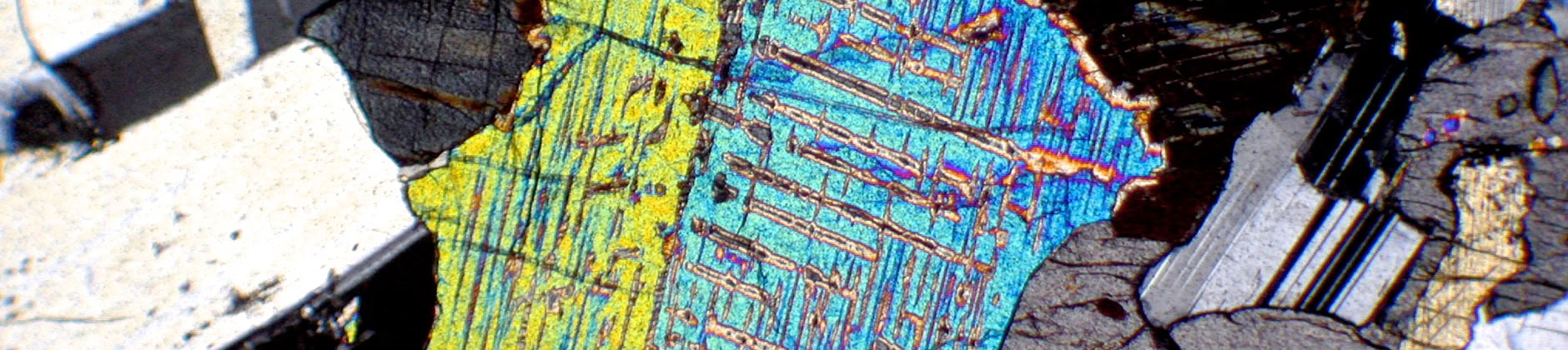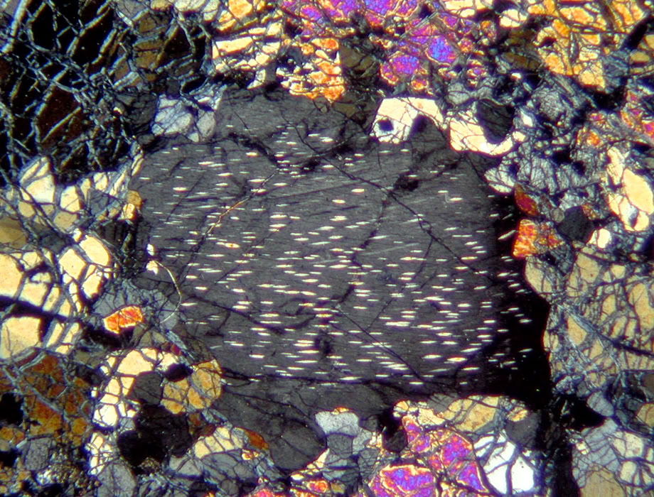 Exsoluciones de clinopiroxeno en un ortopiroxeno tipo enstatita. Polarizadores cruzados.