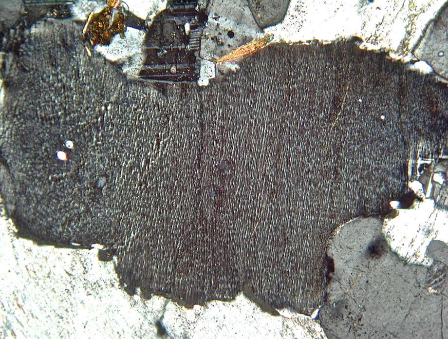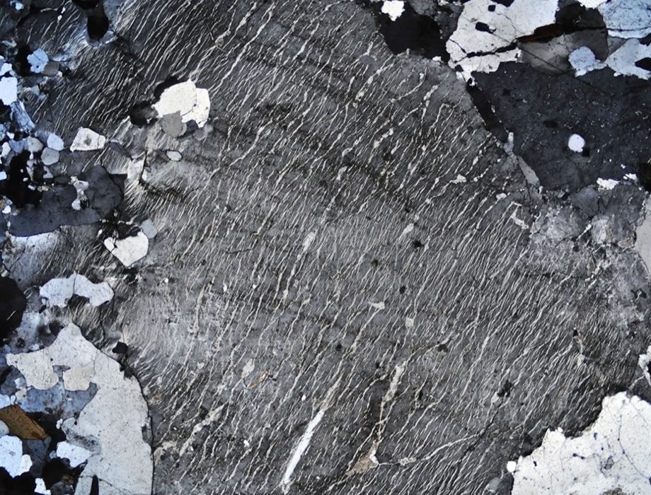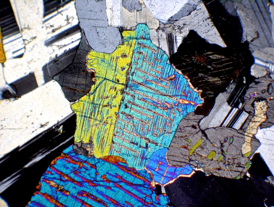 Micropertitas (exsoluciones de plagioclasa sódica) en un feldespato potásico tipo microclina. Polarizadores cruzados.