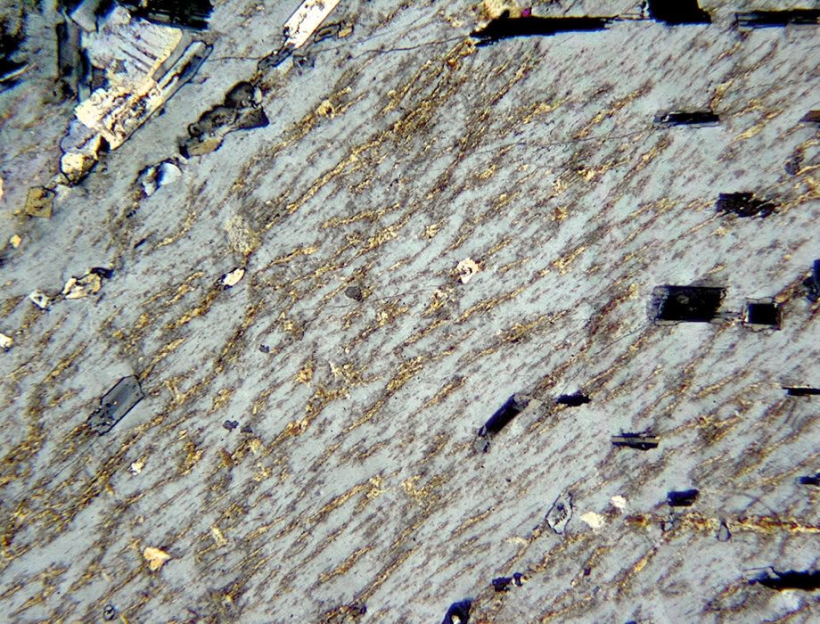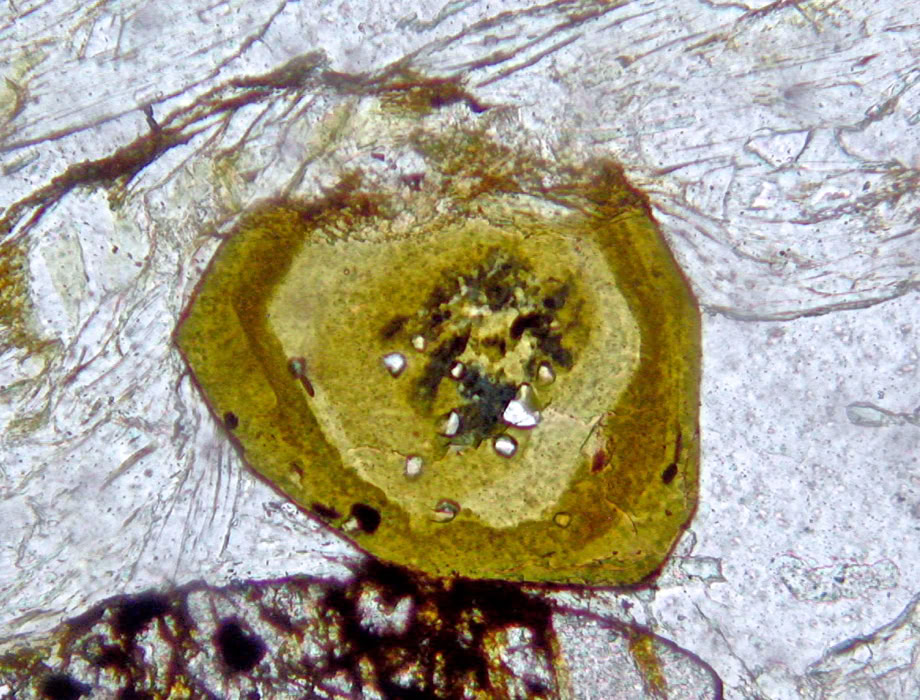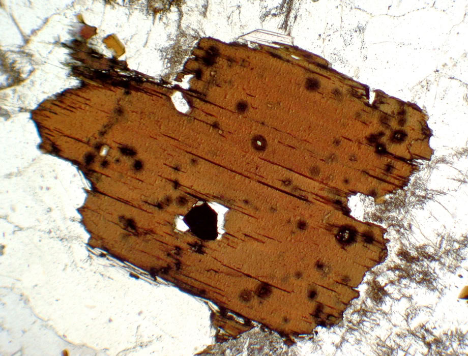 Inclusiones de pequeños cristales de zircón (con el halo negro característico) en un cristal de biotita. Luz polarizada plana.