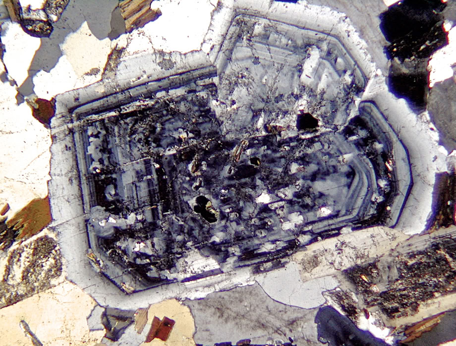Zonaciones concéntricas automorfas en plagioclasa. Polarizadores cruzados.