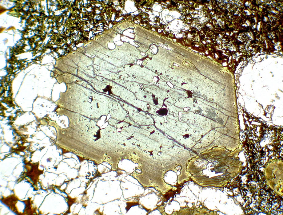 Zonaciones concéntricas en un cristal automorfo de augita. Luz polarizada plana.