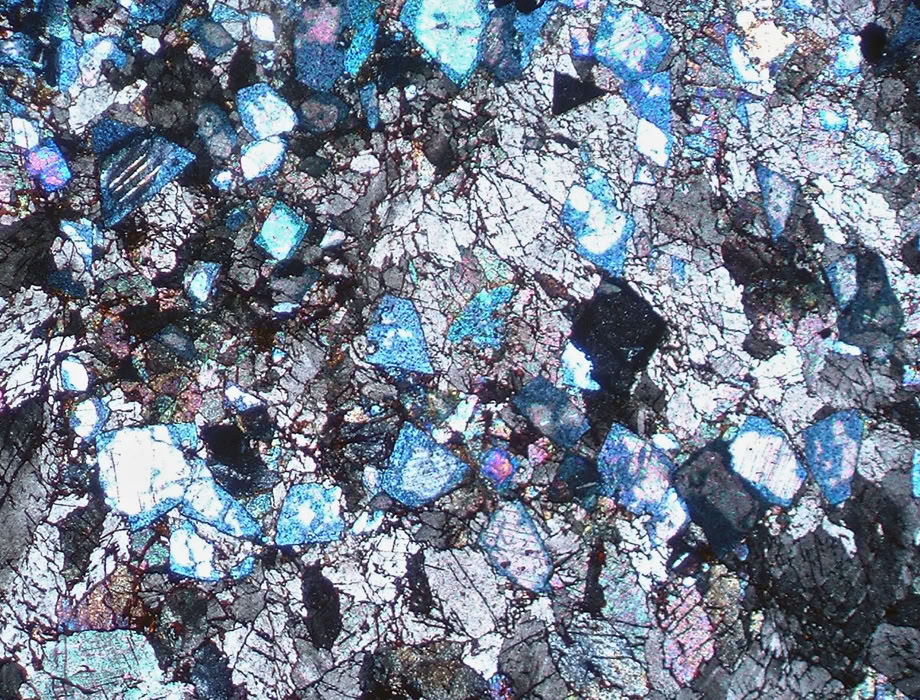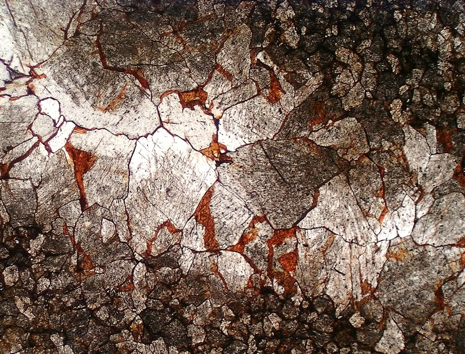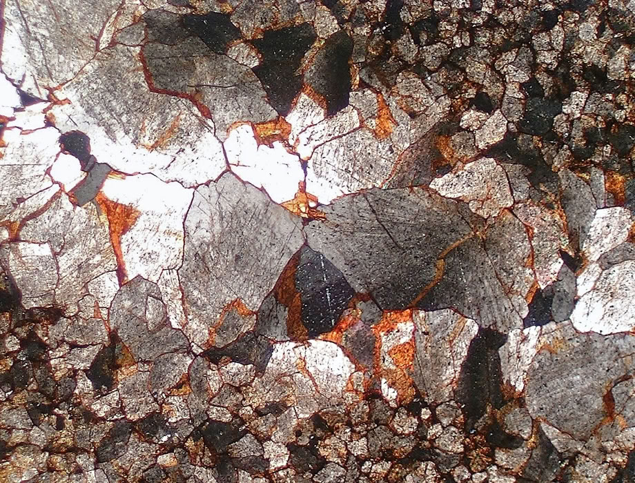 Misma zona, con polarizadores cruzados, mostrando colores de interferencia grises de órdenes superiores, debido a su altísima birrefringencia.